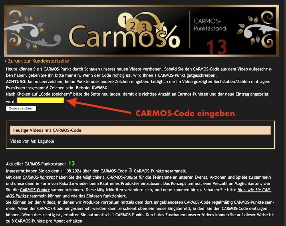 Immer wenn wir ein YouTube-Video veröffentlichen, finden Sie darin an 3 Stellen jeweils einen 2-stelligen Code bestehend aus Zahlen und Buchstaben. Insgesamt besteht der Code aus einer Kombination aus 6 Buchstaben und Zahlen. An dem Veröffentlichungstag zwischen 11:00 und 23:00 Uhr finden Sie in Ihrem Kundenbereich unter CARMOS (siehe Bild unten) ein Eingabefeld speziell für den CARMOS-Code. Wenn Sie den richtigen Code eingeben, erhalten Sie 1 CARMOS-Punkt. Dieser Punkt wird der Gesamtzahl gutgeschrieben und zusätzlich auch dem Konzept LAGUIOLE-GOLD.