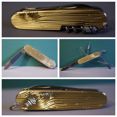 Victorinox Climber mit customized Griffschalen aus Messing in Holzoptik. Findet sich sehr oft in meiner Hosentasche.