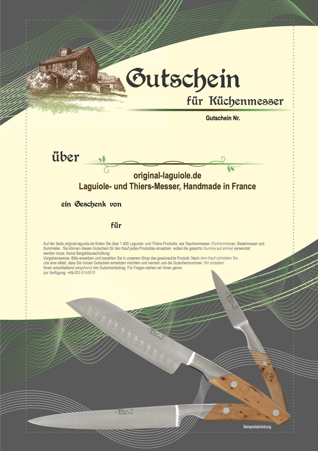 Das Gutschein wird Ihnen als PDF-Dokument nach dieser Bestellung per eMail geschickt. Dieser Gutschein enthält das Design "Küchenmesser".