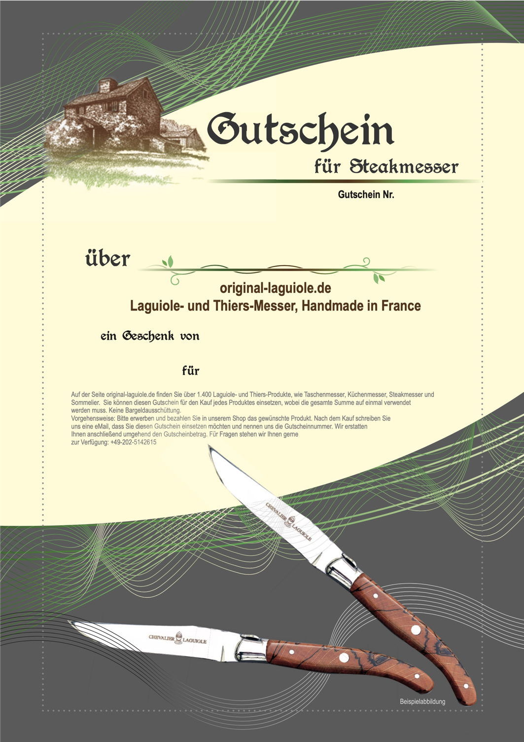 Das Gutschein wird Ihnen als PDF-Dokument nach dieser Bestellung per eMail geschickt. Dieser Gutschein enthält das Design "Steakmesser".