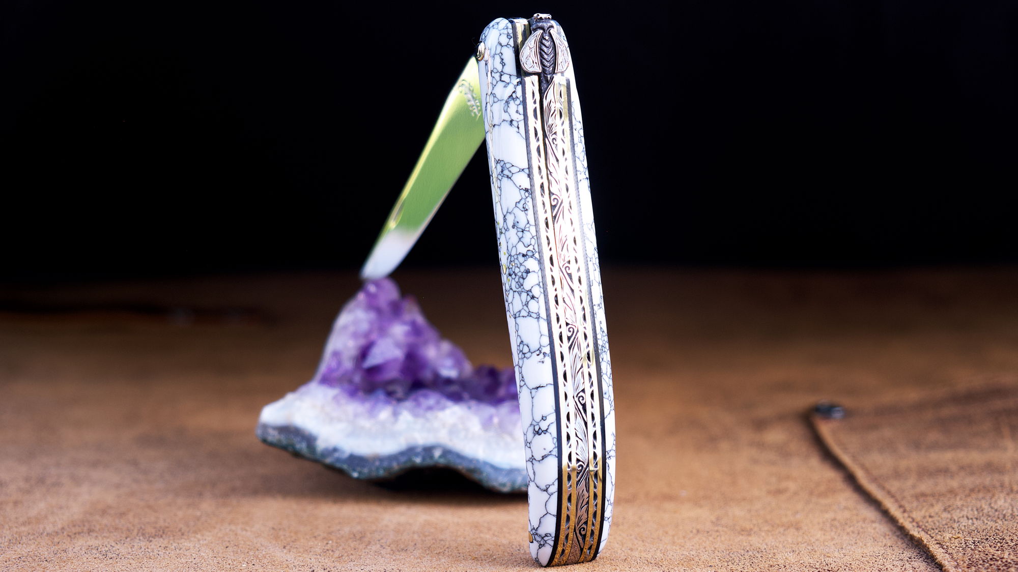 KIVET ist eine außergewöhnliche Edition mit Laguiole-Taschenmessern mit Griffen aus rekonstituierten Steinen hier aus Marmor weiss. Die Steine werden zertrümert, pulverisiert und anschliessend mit einer besonderen Kunstharzmischung stabilisiert. Ein einmaliges Verfahren mit phänomenalen Ergebnisse wie man an diesem Laguiole-Taschenmesser sehen kann.