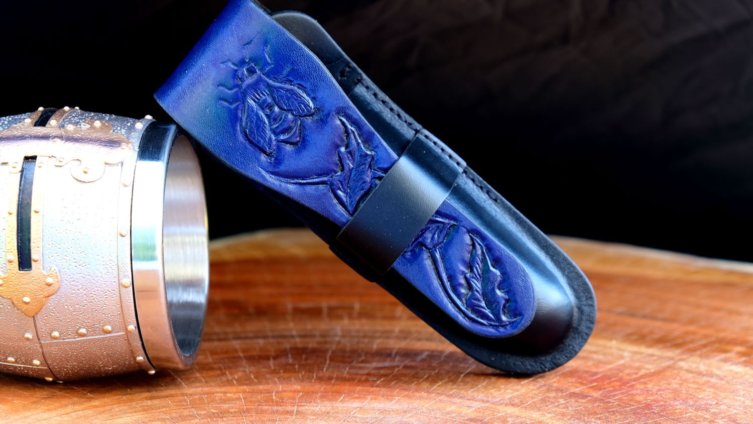Mit der ABEILIA Lederscheide können Sie die Schönheit eines Laguiole-Messers stilvoll nach außen tragen - dies ist die angemessene Art und Weise, ein Laguiole zu präsentieren! Die vordere Seite des Etuis wurde von unserer Designerin handgefertigt und verarbeitet. Die ABEILIA Edition ist streng limitiert. Jedes Lederetui ist ein Unikat und absolut einzigartig, da das Motiv jedes Mal von Hand in das Leder eingearbeitet und blau eingefärbt wird.