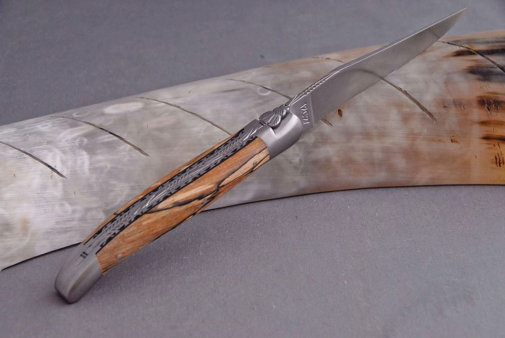 Das für dieses Messer verwendete besonders schön gemaserte Hartholz wurde in unmittelbarer Nähe der Schmiede auf der Hochebene des Aubrac gesammelt.