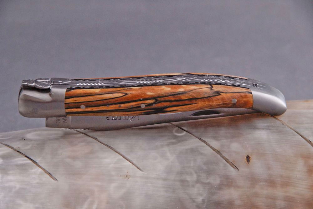 Ein wunderschönes Messer mit einer hervorragenden Guillochage und eine schön marmorierte Aubrac Buche als Griff. Laguiole Aveyron wird bei Laguiole en Aubrac hergestellt, so dass man eine gewohnt hohe Qualität erwarten darf.