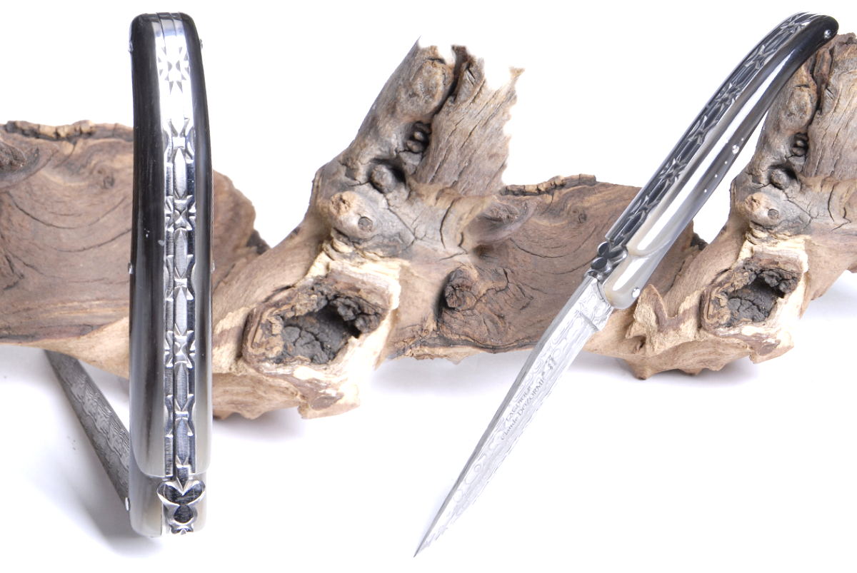 Diese Reihe perfekt hochwertiger Laguiole Messer ist etwas ganz Besonderes, denn der Griff ist aus hellem Horn. Der Anblick dieses Messers ist atemberaubend, denn sowohl der Rücken des Messers als auch die Klinge sind verziert.