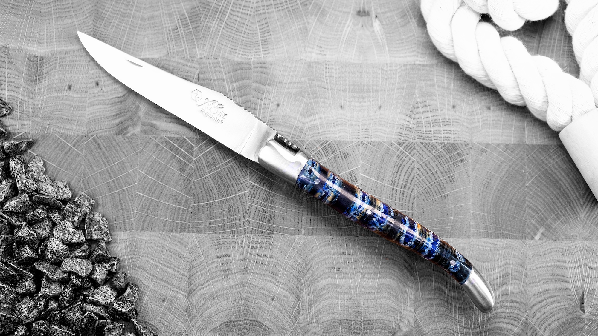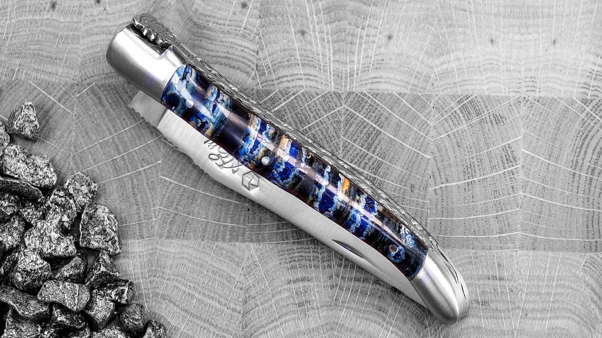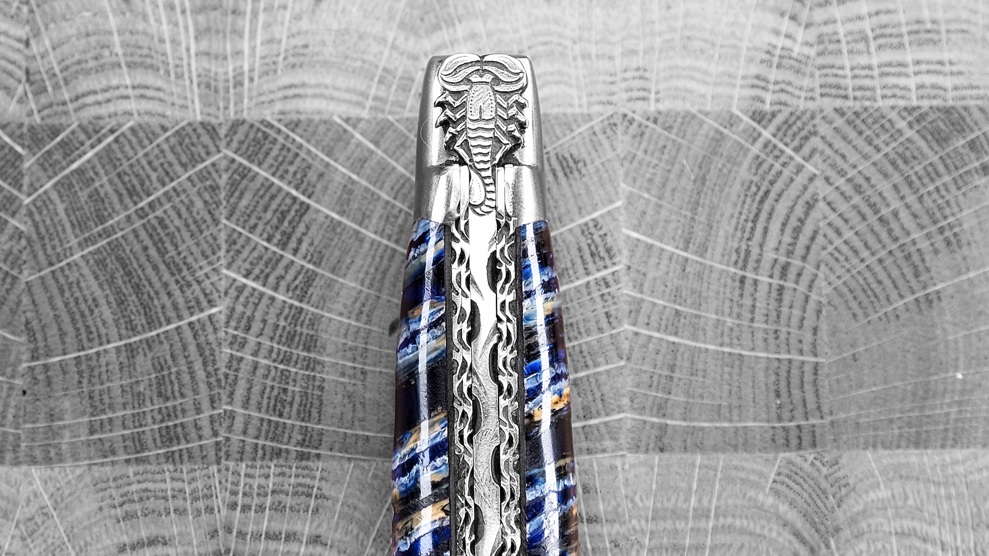 Dieses Messer wird speziell für original-laguiole.de hergestellt und ist nur hier käuflich zu erwerben. Dieses Messer ziert statt der Biene ein Skorpion. Eine einmalige Handarbeit höchster Präzision. Zudem ist der Griff aus blaugefärbten Mammutbackenzahn.