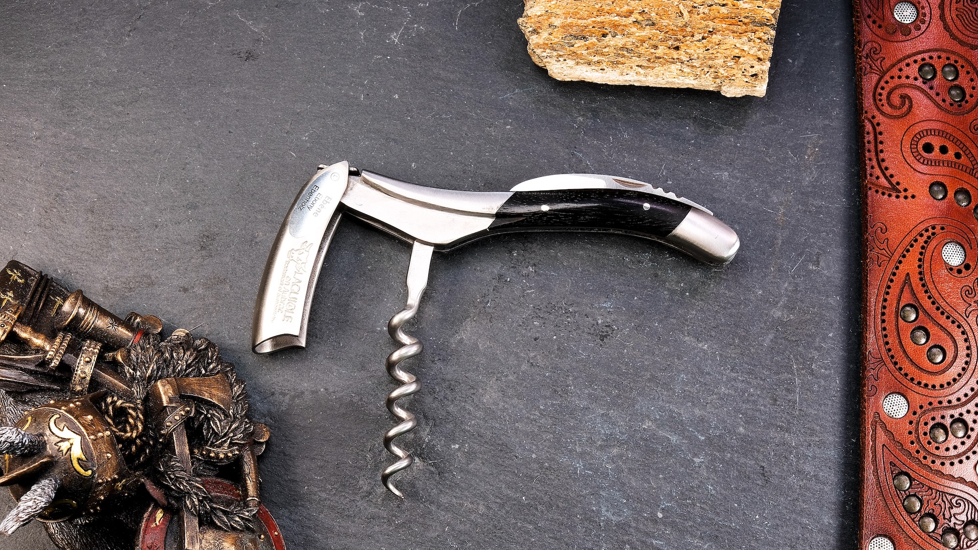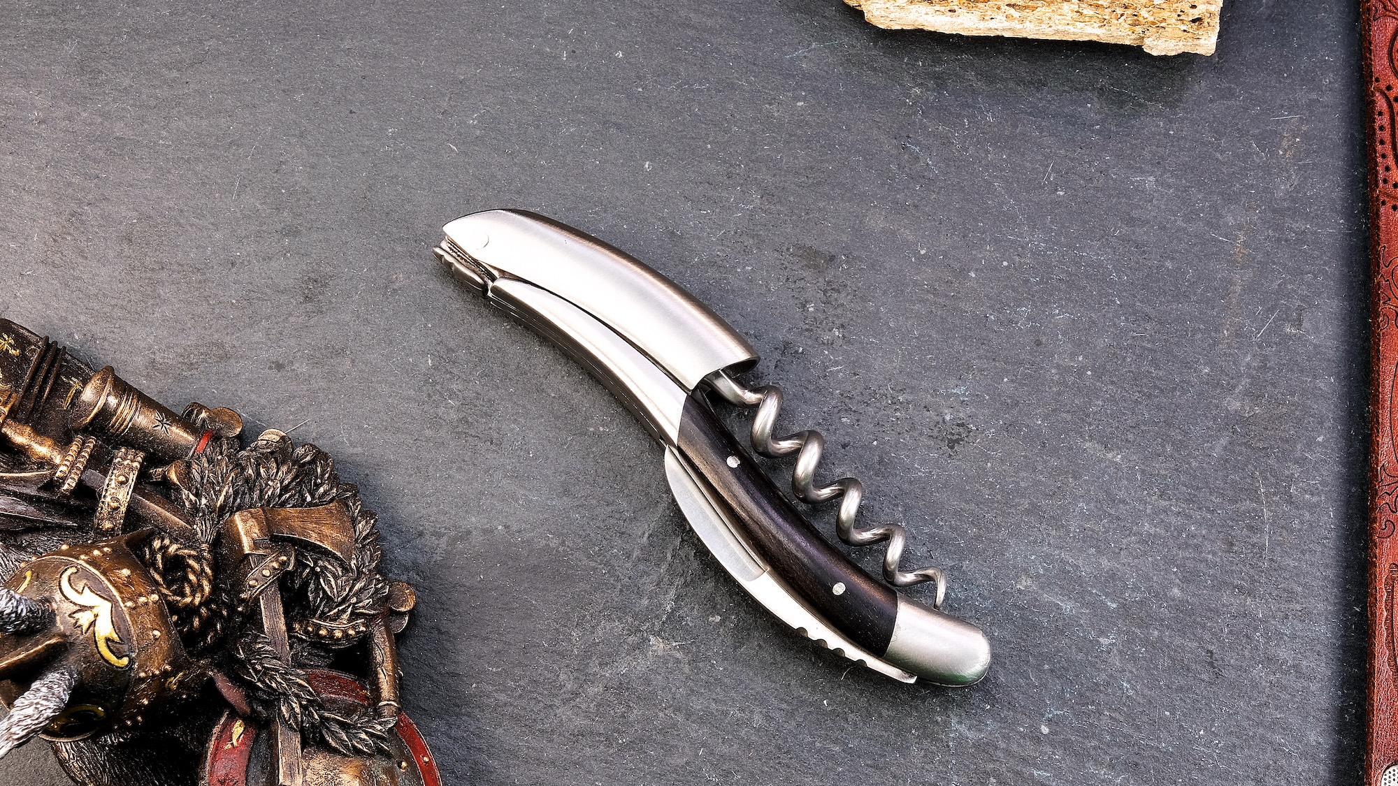 Dieser edle Laguiole-Sommelier aus der traditionsreichen Schmiede Laguiole en Aubrac überzeugt durch seine elegante Linienführung und seine handwerkliche Perfektion. Der Griff besteht aus tiefschwarzem Ebenholz, dessen natürliche Dichte und feine Maserung dem Stück eine zeitlose, luxuriöse Ausstrahlung verleihen. Die präzise gefertigte Spirale mit fünf Windungen greift zuverlässig in so gut wie jeden Korken und ermöglicht ein sauberes, kontrolliertes Herausziehen, ohne den Korken zu beschädigen. In Kombination mit dem perfekt ausbalancierten Hebelmechanismus bietet dieses Werkzeug die wohl artgerechteste und stilvollste Möglichkeit, eine Weinflasche zu öffnen – ein unverzichtbarer Begleiter für Weinliebhaber, Sommeliers und alle, die Genusskultur schätzen.