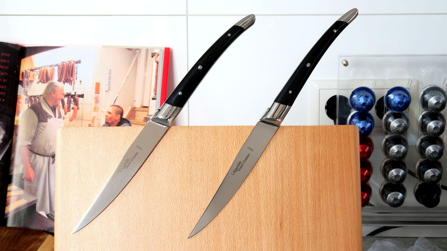 Es sind moderne Vertreter der Laguiole-Machart, simpel, schlicht und dennoch von einer bewunderswerte Qualität, typisch für Goyon Chazeau. Diese Steakmesser werden aus einem Stück Stahl angefertigt - es wirkt sich auf die Haptik, Optik und das Gefühl bei jedem Schneiden damit!