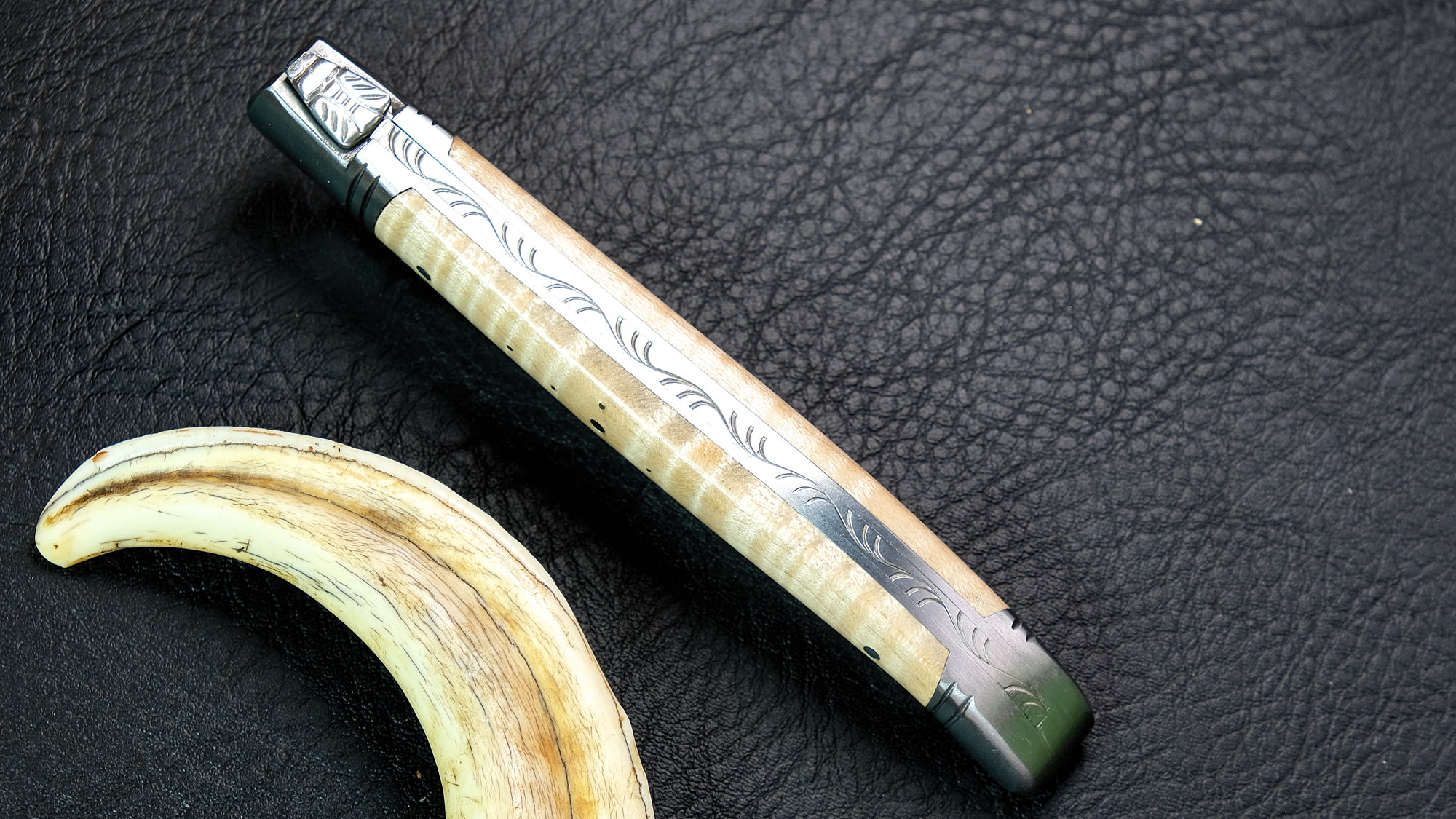 Mit "Le Fidéle" Laguiole Messern können Sie sicher sein, ein echtes, in einer französischen Traditionsschmiede gefertigtes, Laguiole Messer höchster Qualität zu erhalten. Die auserlesenen Edelhölzer und der hochwertige rostfreie Sandvik-12C27 Stahl mit langer Schnitthaltigkeit runden dieses perfekte Messer ab. Hier sehen Sie ein edles "Le Fidéle" mit einem sehr feinen, hellen Ahornholz-Griff. Der Anblick dieses Messers ist atemberaubend, denn sowohl der Rücken des Messers als auch die Klinge sind verziert.