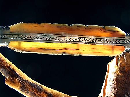 Das spiralförmig, gewellte Oberfläche des Widderhorns hat eine extrem dekorative Eigenschaft. Nachdem einzelne Teilestücke aus dem Horn geschnitten wurde, müssen diese aufwändig durch Wärme und Druck gerade gebogen werden, um als Griffschale genutzt werden zu können. Die Schalen werden oft als Kruste für den Griff verwendet. Dabei macht man sich nicht nur die wunderschön strukturierte Oberfläche zunutze, sondern der Horn ist teilweise transparent, wenn es gegen das Licht gehalten wird. Es ist wirklich ein wunderbares Griffmaterial, welche lange bewundert werden kann.