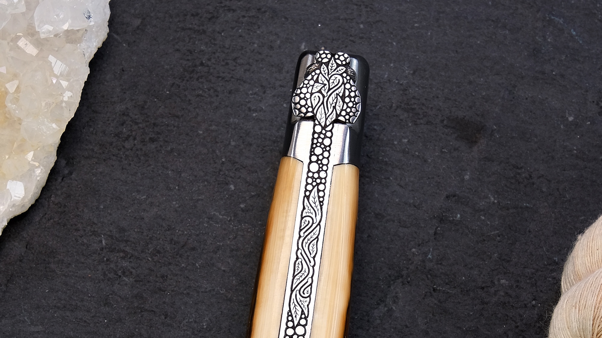 Coutellerie GM: GM in dem Namen steht für Mickael Ginisty, ein sehr junger Messermacherkünstler aus Frankreich, der direkt von Beginn an phänomenale Kunstwerke schafft. Er hat 6 Jahre bei Laguiole Honore Durand gearbeitet, anschliessend bei Laguiole Village. Nun hat er sich selbstängig gemacht und wird anhand seiner Messer direkt mit den großen Messermacherkünstler in Frankreich verglichen. Wir möchten gerne solche jungen Künstler fördern und sie durch unsere Möglichkeiten bekannter machen.