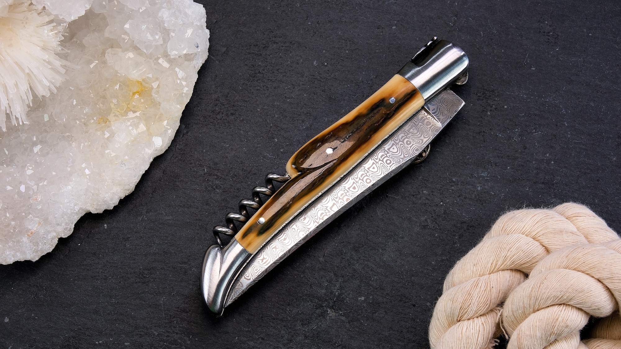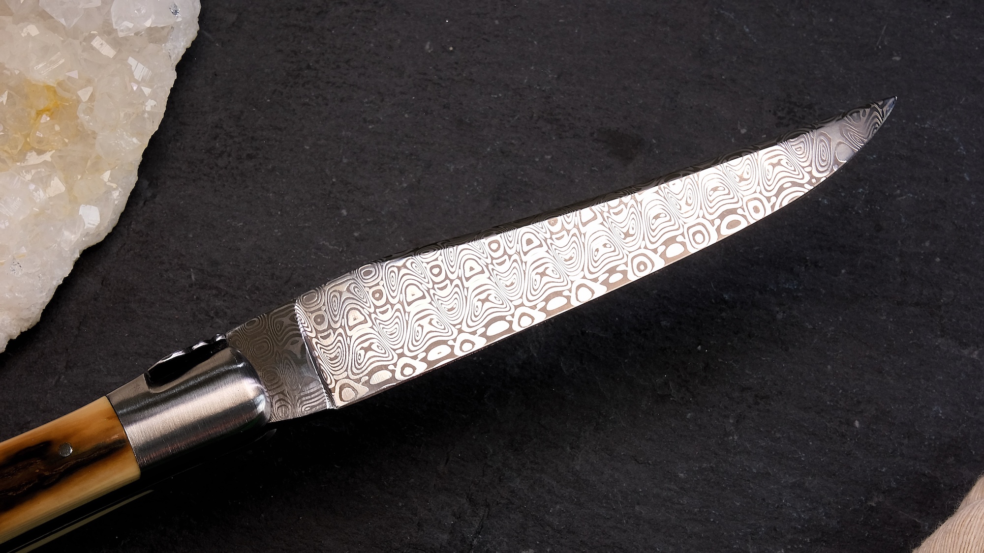 Laguiole Taschenmesser Mickael Ginisty, Edition: 5 BEAUTIES 45d, Mammutstoßzahn, Korkenzieher, brosse, guillochierte Biene, Damast