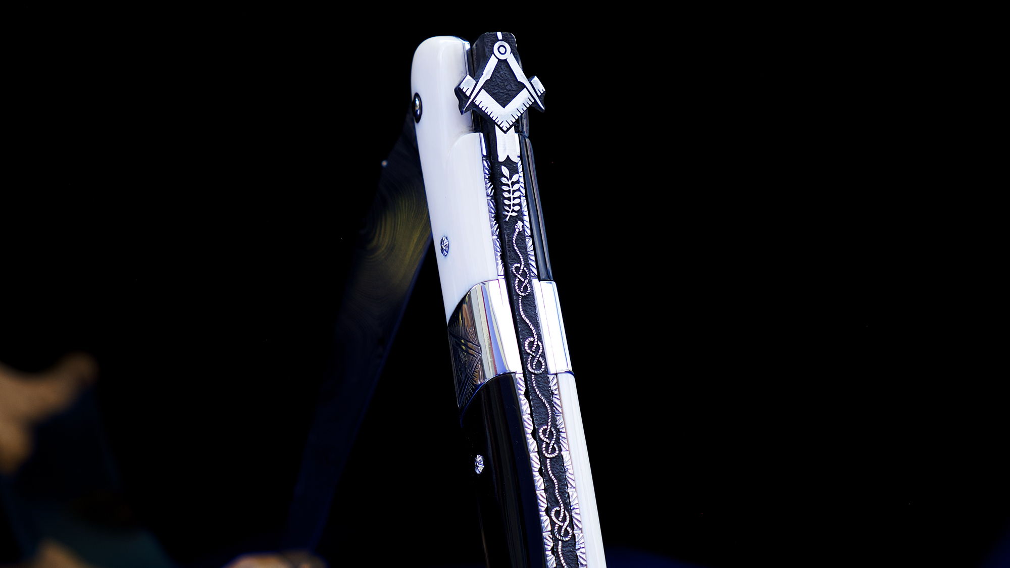 Die Laguiole-Taschenmesser Edition Freimaurer wurde gemeinsam mit dem Messermacherkünstler Philippe Voissiere entworfen und ist voller Freimaurer-Symbole und in einer für den Künstler gewohnten hervorragenden Umsetzung in Perfektion kaum zu übertreffen. Die schwarz-weissen Griffe aus Büffelhorn und Mammutstoßzahn sowie die wunderschöne rostfreie Damastklinge von Damasteel ergänzen die unglaubliche Kunst. 2 faszinierende Messer extrem detailliert und perfekt gestaltet - für jeden Freimaurer-Meister das perfekte Messer.