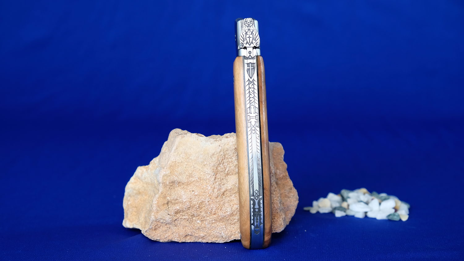 Die Rückenguilochierung wurde von original-laguiole.de designt und von den Messermacher in Frankreich hervorragend in den Messers der Aveline-Collection umgesetzt. Das Schwert und das Schield wurden in der Gestaltung des Rückens als besonderes Zeichen der Chevalier-Messer implementiert. Die schwarzen Einlagen zwischen dem Holzgriff und der Rückenverziehrungen erhöhen den Kontrast und verleihen dem Messer eine besondere Aura. Das DROP9-System erleichtert das Öffnen und Schliessen der Messer dieser Edition.