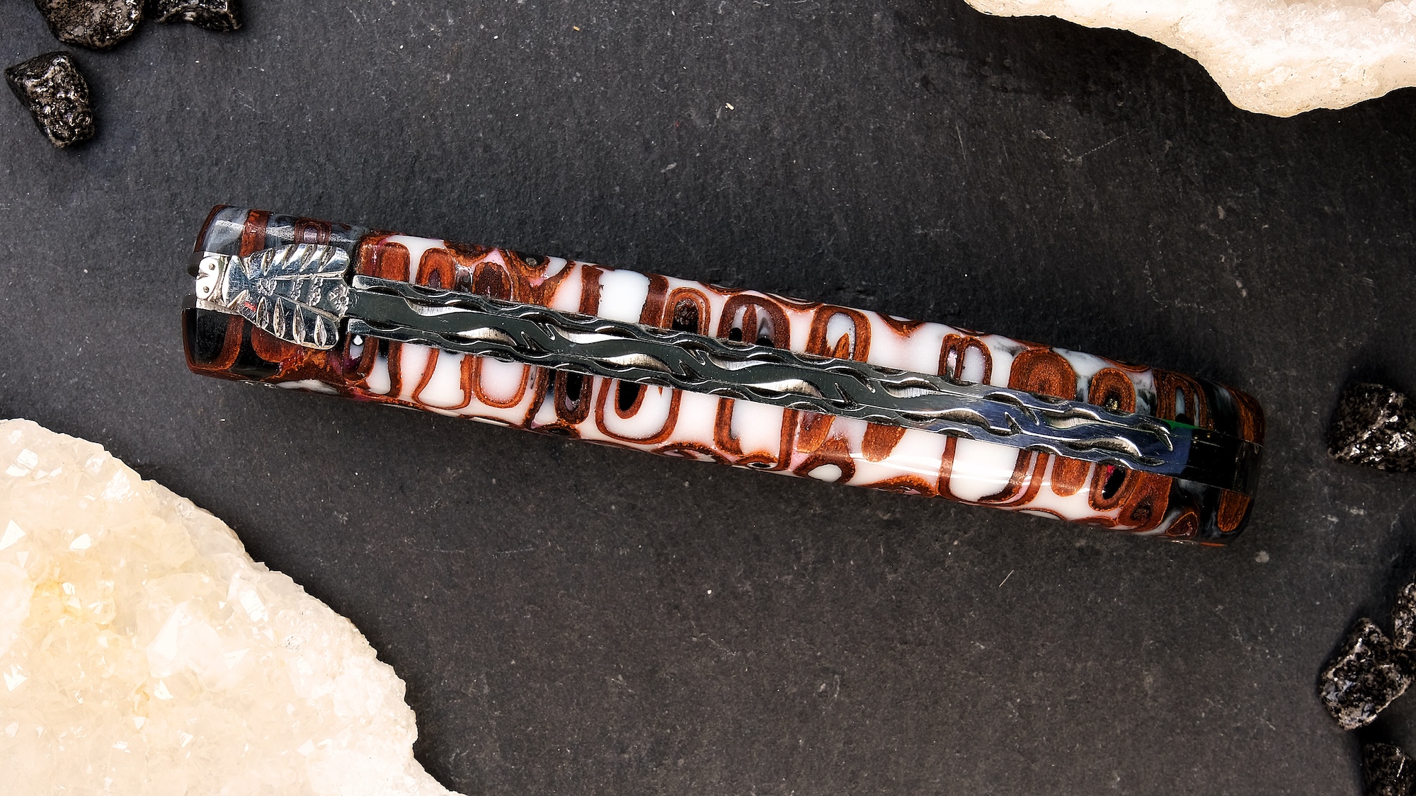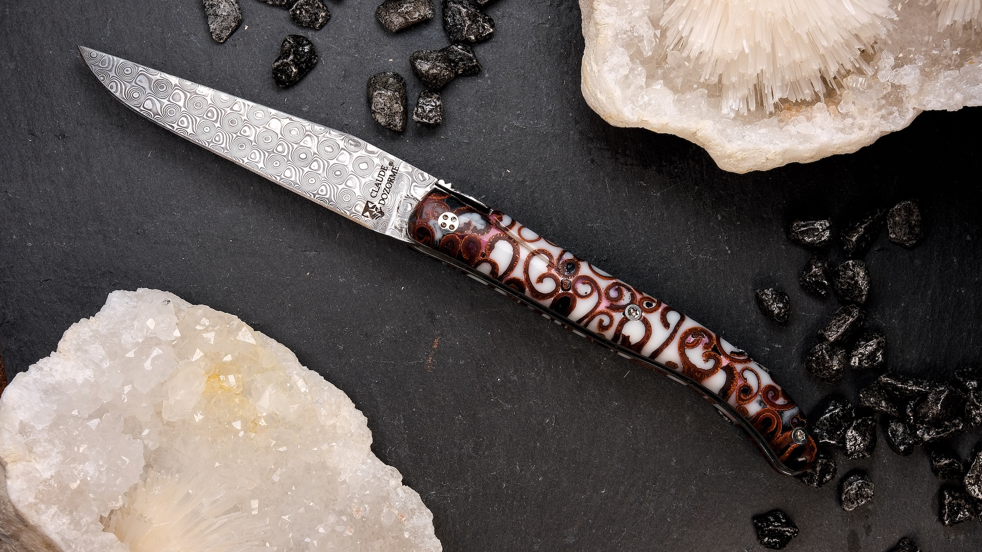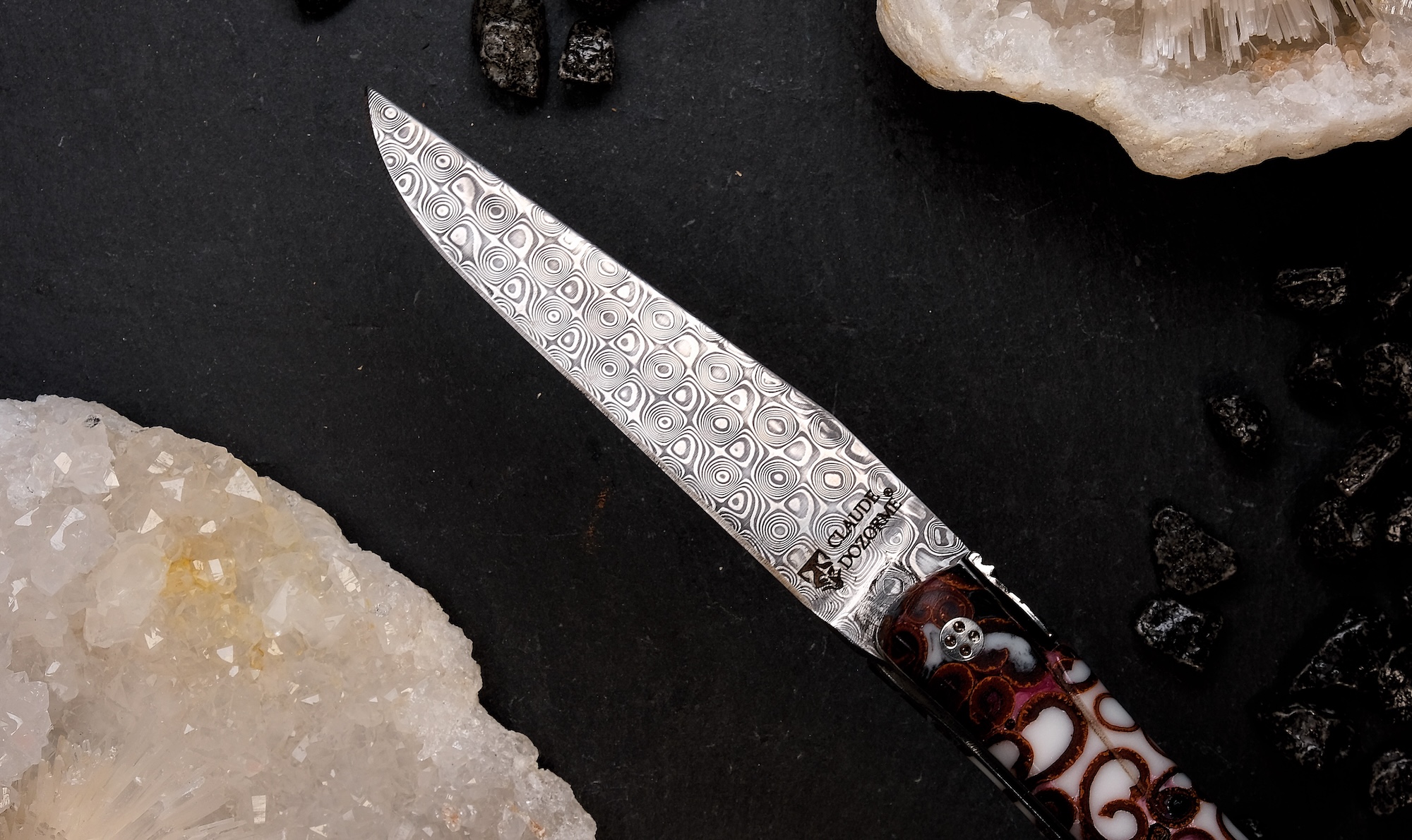 Die dezent gestaltete Fliege, die aufwendig in 3D gearbeitete Guillochage und die atemberaubende Damastklinge mit rund 120 Lagen rostfreiem Balbach-Damast (Made in Germany) zeugen von höchster Messermacherkunst aus dem Hause Claude Dozorme.