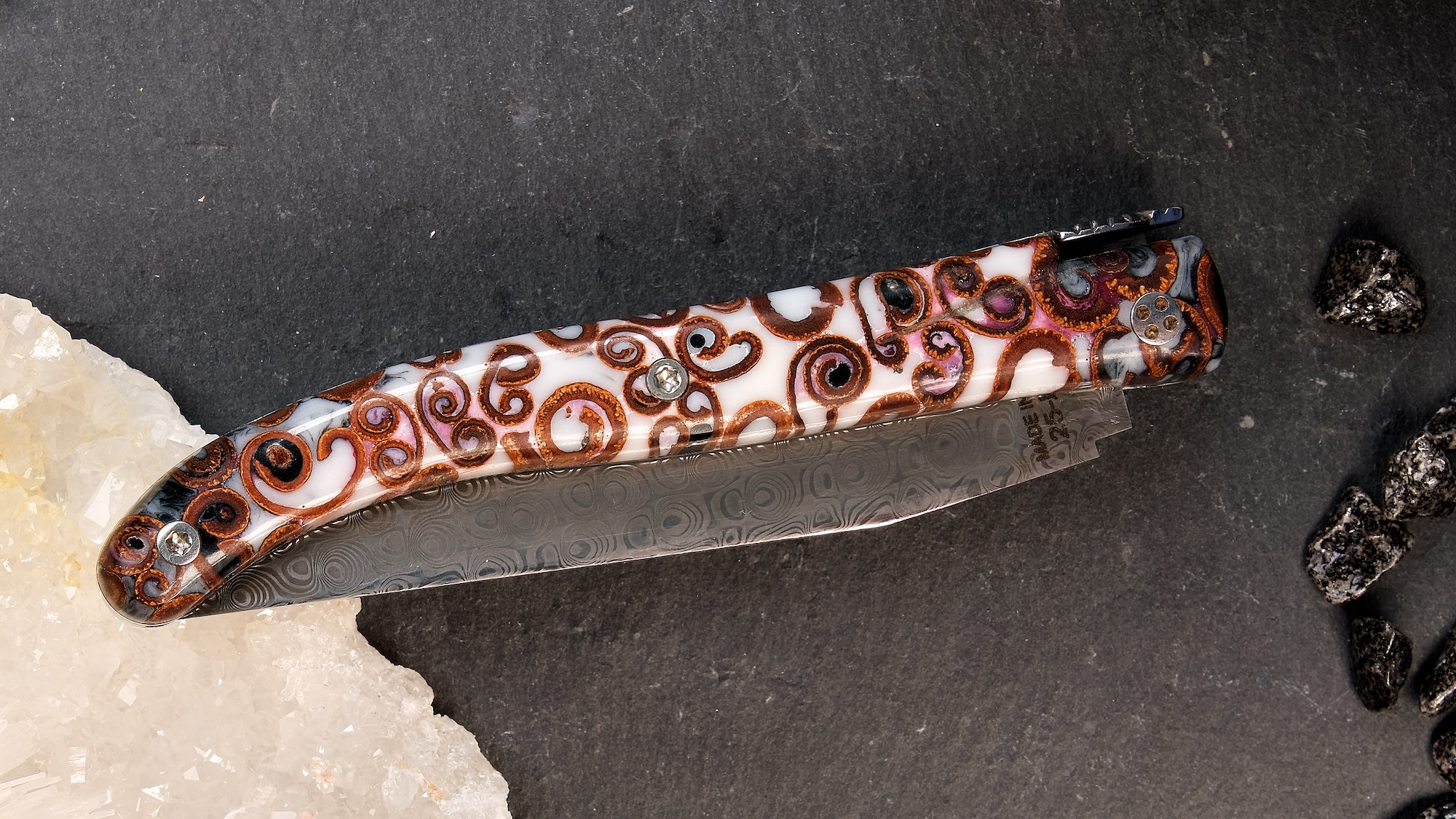 Taschenmesser Laguiole Claude Dozorme, Edition JOOM 09, Damast, Zimt weiß, Plein, brillant, guillochierte Biene