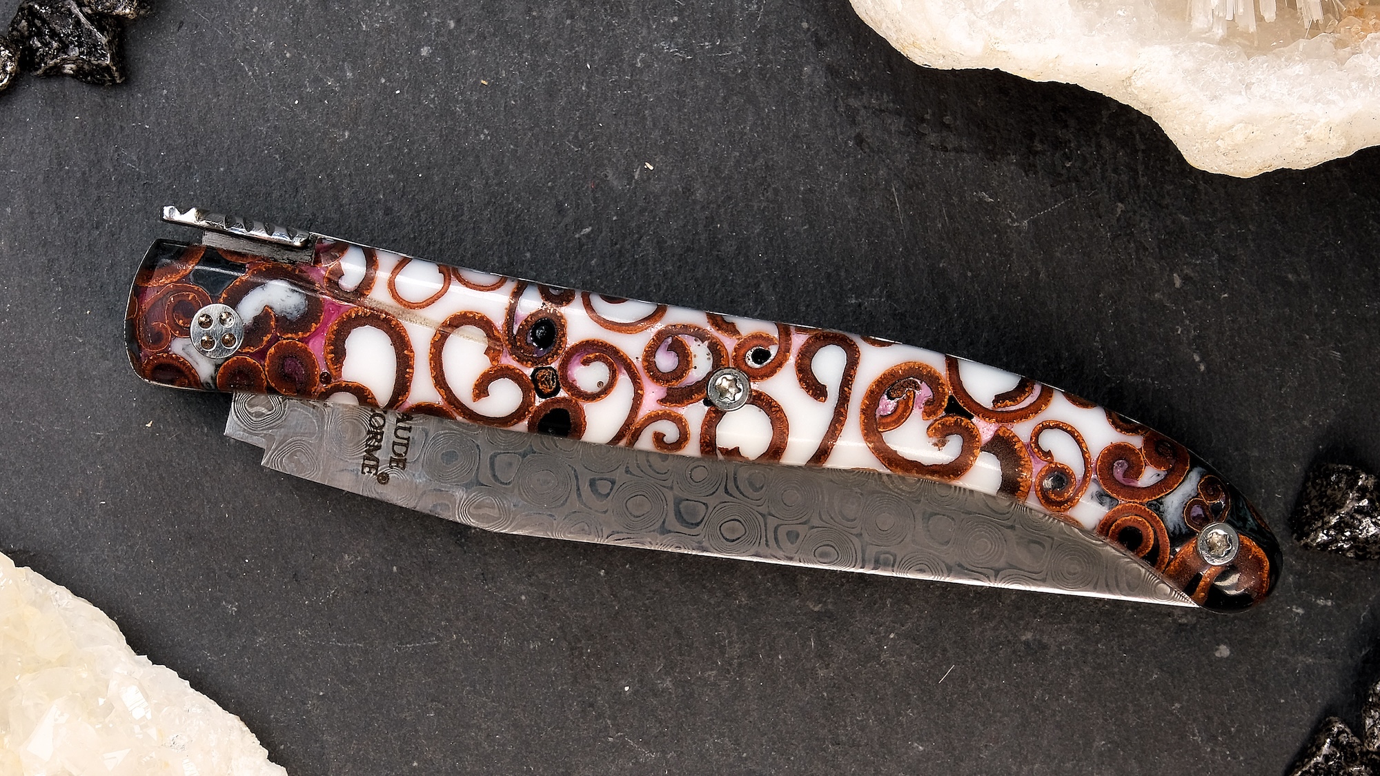 Besonderheit: Die Messer von Claude Dozorme haben einen Klingenschutz, der das Anschlagen der Klinge auf das Ressort vehindert.
