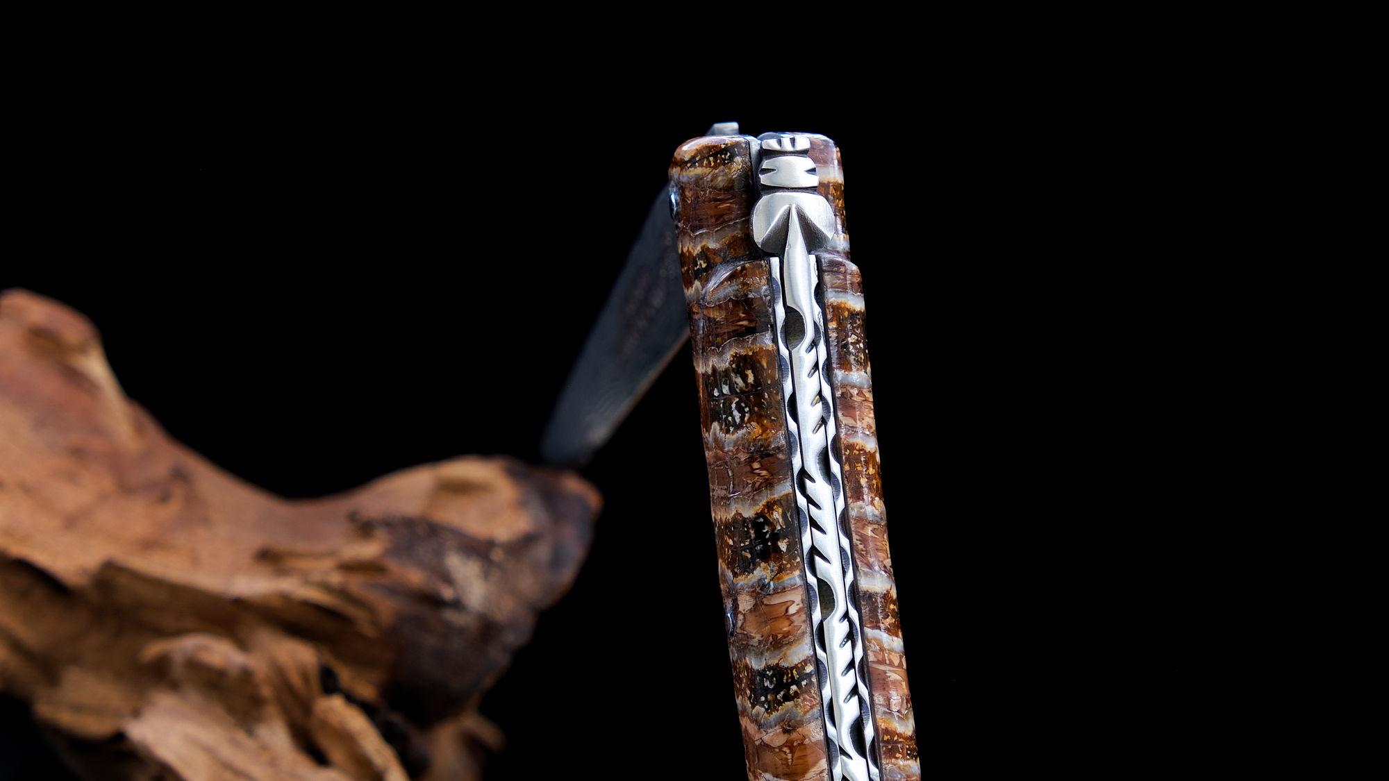 Die Backenzähne des Mammuts gehören zu den wohl schönsten und beeindruckensten Griffmaterialien überhaupt. Die wunderschöne Färbung im Material kommt durch die Einlagerung von verschiedenen Mineralien aus dem Boden des Fundortes und die Farbe des Kunstharzes, die zum Stabilisieren benutzt wurde.
