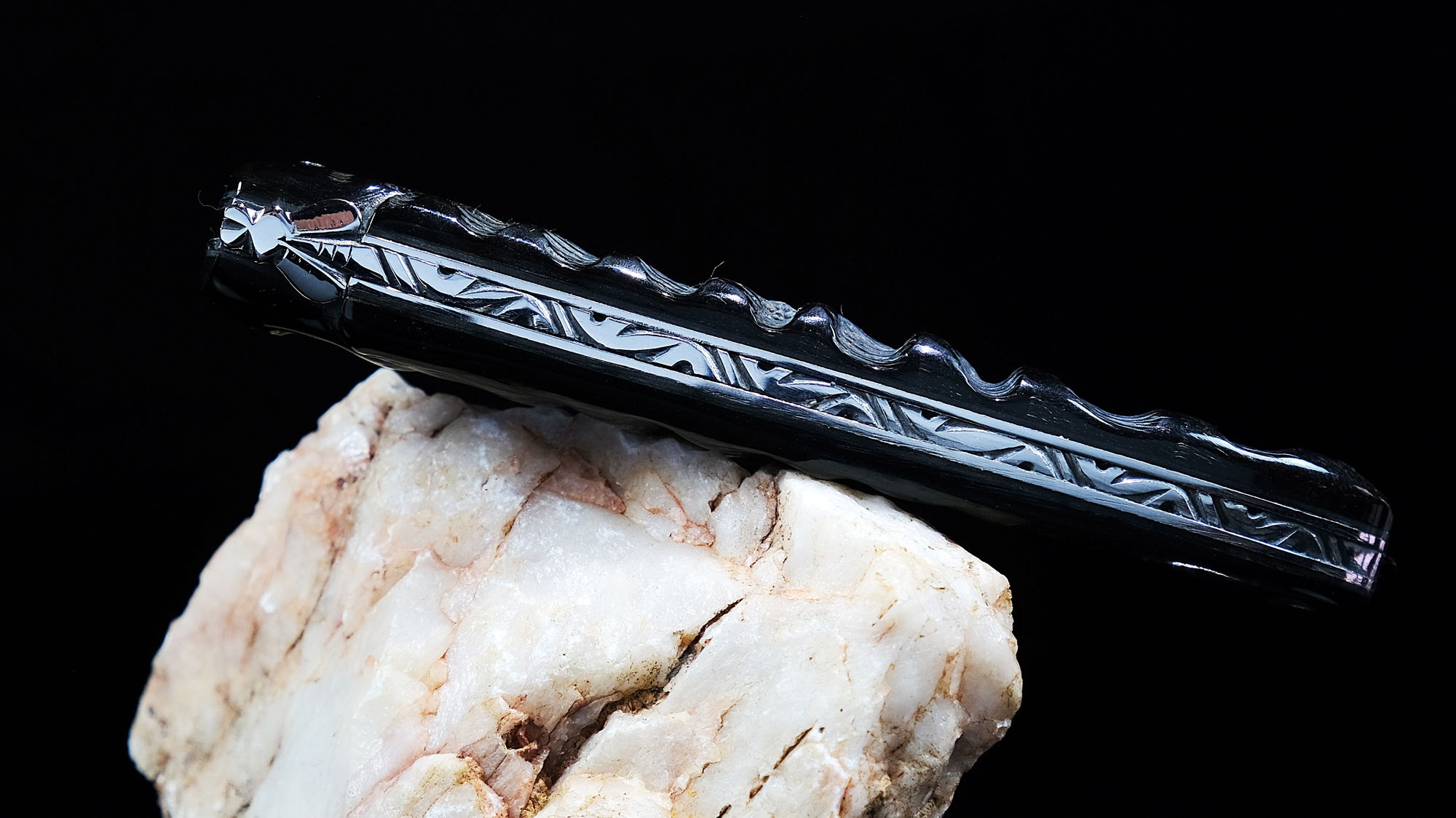 Dieses Meeser hat keine Metallbacken, sondern hat einen Griff aus einem Stück. Eine wunderschöne Rückendekoration ziert das Messer.