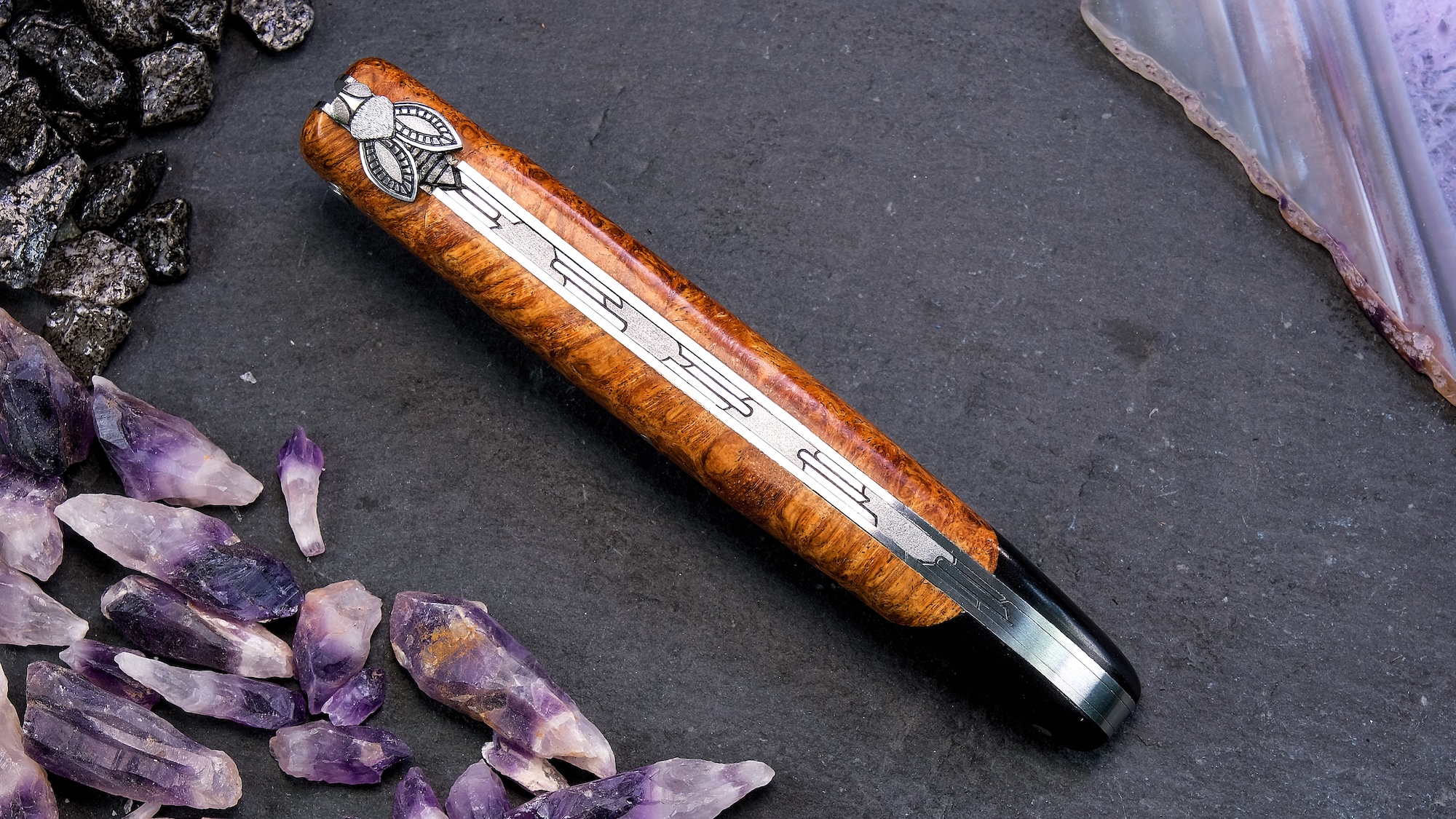 * Griff: goldene Amboina-Maserknolle und Ebenholz