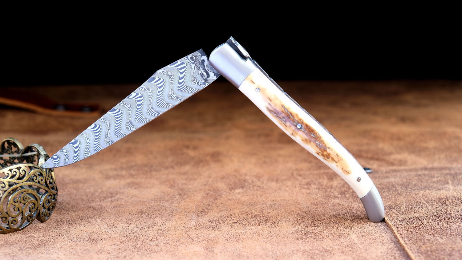 Das Taschenmesser MERCOL 11 by Laguiole en Aubrac hat eine wirklich außergewöhnliche Bienen, einen unglaublich einmalig gestalteten Rücken, der Griff aus seltenem Mmmutstsszahn und eine Klinge aus Balbach Damaststahl ( mit 160-250 Lagen ). Einmal mehr beweist der Messermacherkünstler Frederich sein Können - die wunderbare Symbiose aus Griffmaterialien, Klinge, Biene und Guillochage zu einem Konzeptmesser.