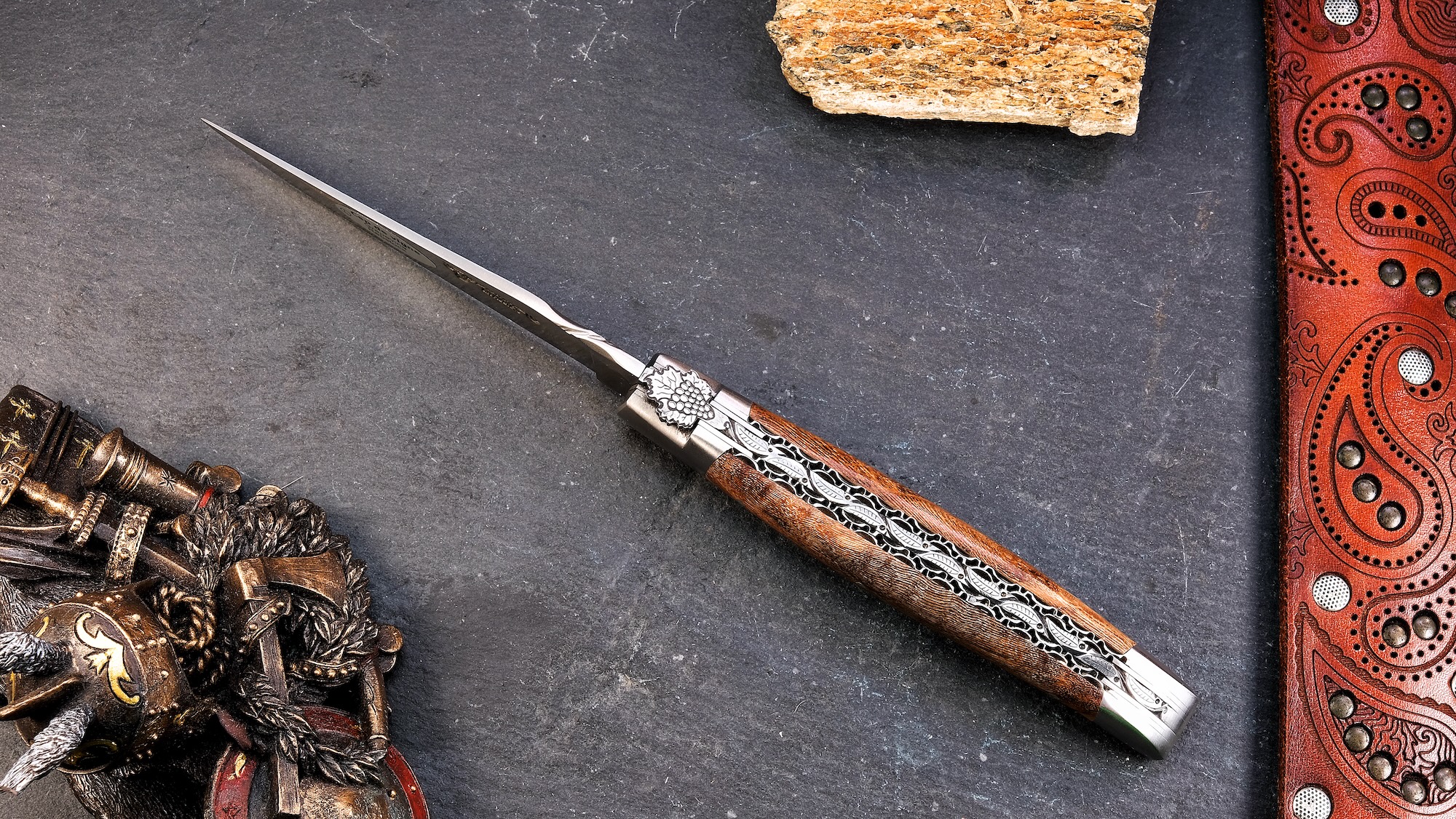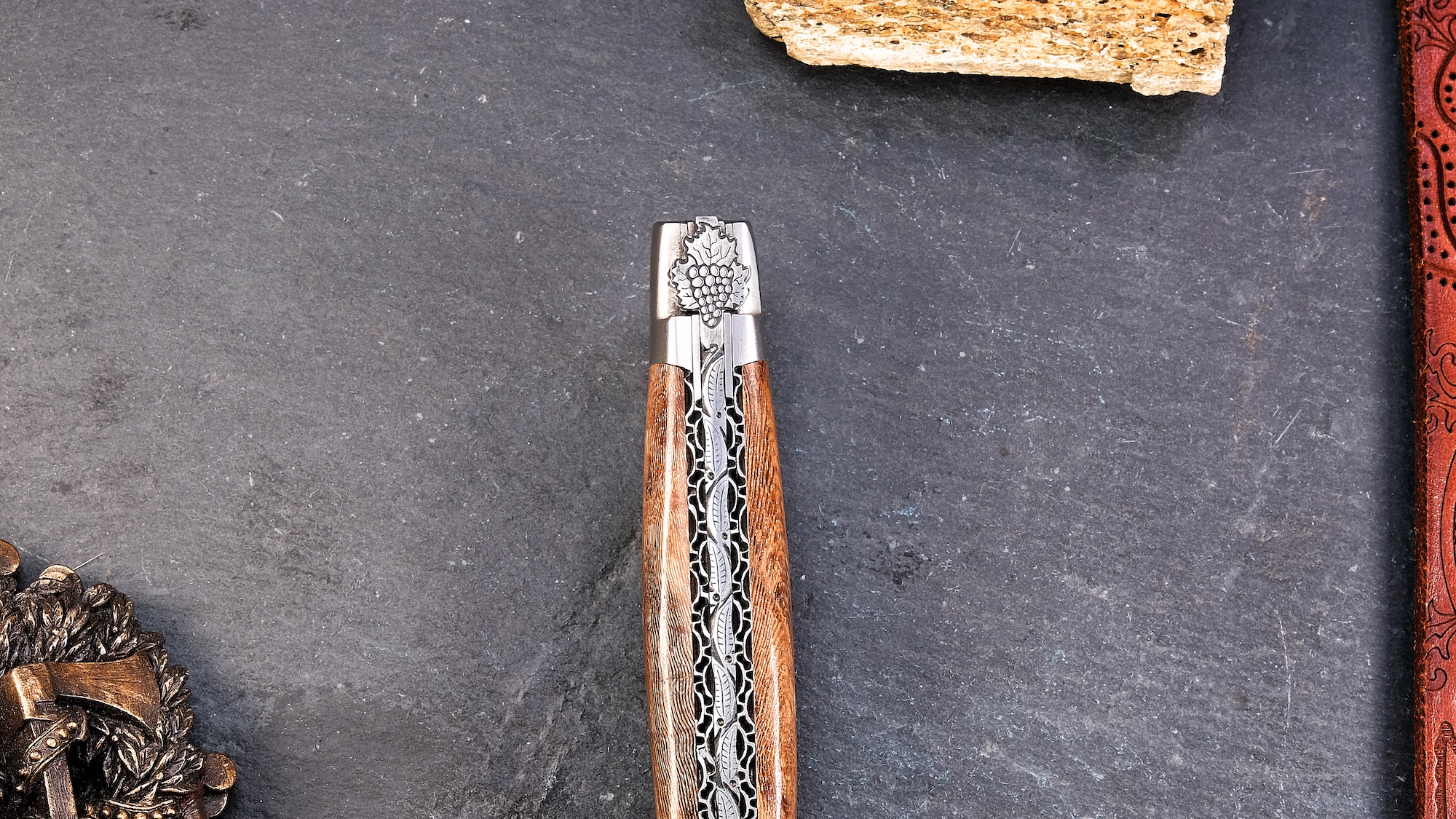Das Laguiole-Taschenmesser Edition TRAUBE ist ein wahres Meisterwerk feinster Handwerkskunst. Der Messermacherkünstler von Laguiole en Aubrac hat mit der kunstvoll gestalteten Traube, die die klassische Biene ersetzt, ein außergewöhnliches Detail erschaffen. Rebstockholz – so selten wie charaktervoll – und die kunstvoll verzierten Double Platines verleihen dem Messer eine unvergleichliche Ausstrahlung. Ein absoluter Hingucker, dem man sich einfach nicht entziehen kann – jedes Detail begeistert, jede Linie erzählt eine Geschichte.