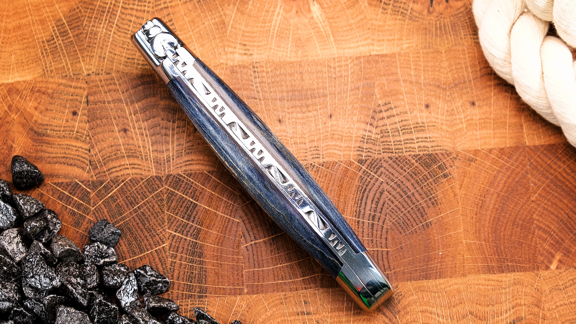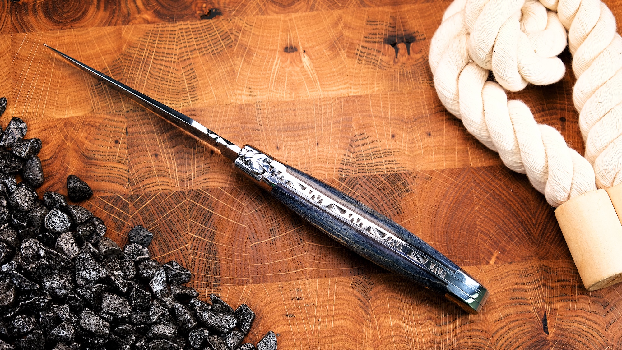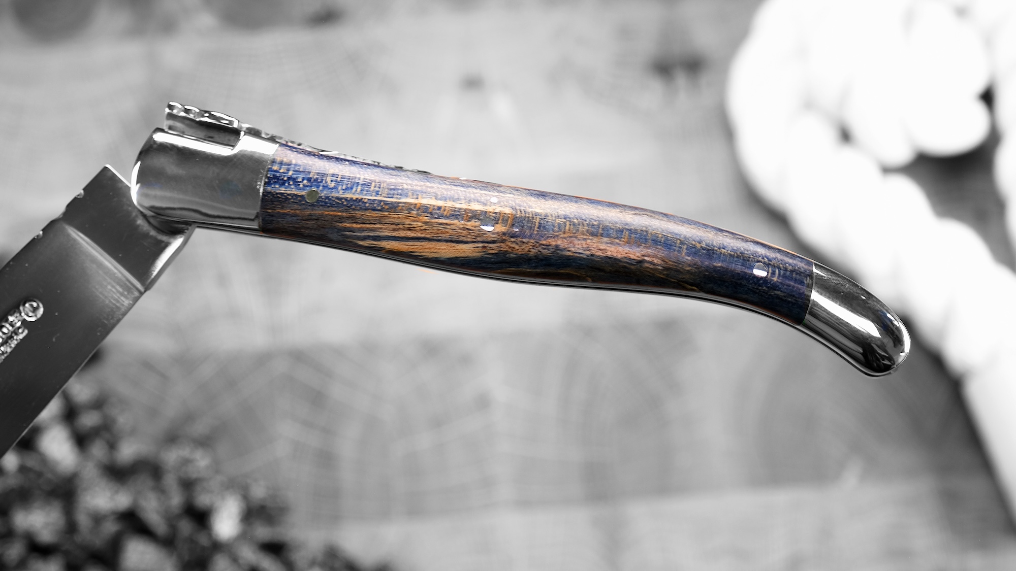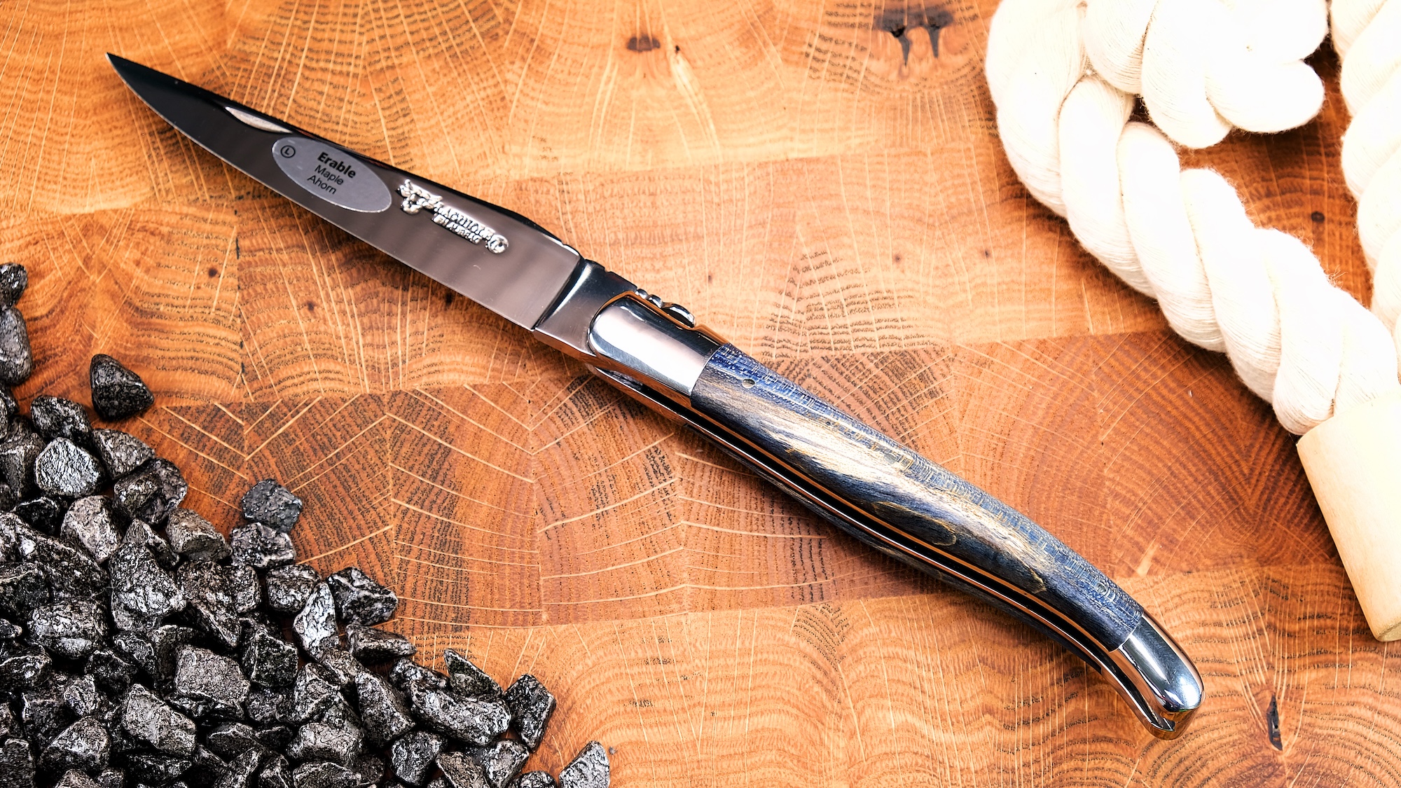 Dieses Laguiole en Aubrac Taschenmesser vereint traditionelle Handwerkskunst mit einer außergewöhnlichen, modernen Farbgebung. Der Griff aus blau gefärbtem Ahornholz begeistert durch seine lebendige Maserung und verleiht dem Messer eine elegante, zugleich ausdrucksstarke Optik. Jedes Stück ist ein Unikat, denn die natürliche Struktur des Holzes bleibt trotz der Färbung sichtbar.