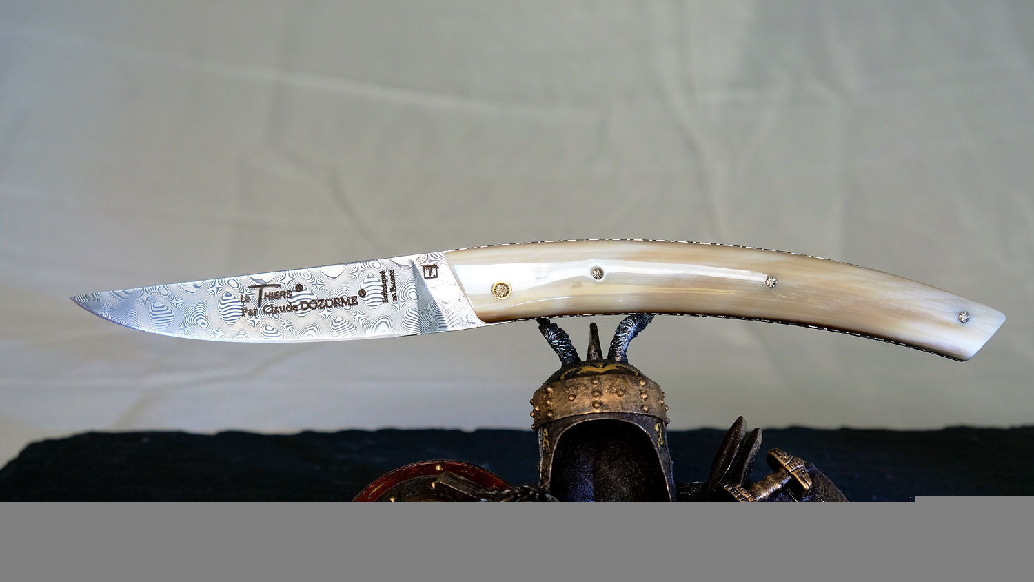 Ein besonderes Thiers-Messer von Claude Dozorme mit einer ungewöhnlich detailreiche Rückenverzierung und einer wunderschönen Damastklinge. Selbst die Nieten sind außergewöhnlich gestaltet. Dieses Thiers-Messer ist eine besondere optische und haptische Erfahrung, denn es fühlt sich unglaublich gut an, sowohl von der Oberflächenbeschaffenheit als auch vom Gewicht - es ist ales einfach perfekt!