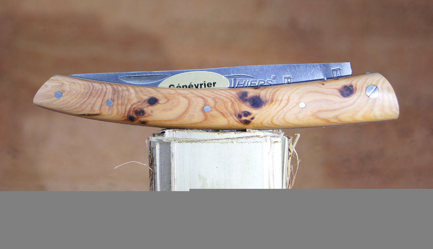Die Griffe aus wohlriechendem Wacholder haben eine wunderschöne Maserung und verleihen dem Messer eine unglaublich edle Anmutung. Dazu die sehr dynamische Form eines Thiers-Messer und wir haben ein tolles Alltagsmesser, das nicht nur perfekt im Gebrauch ist, sondern auch ein optischer Leckerbissen ist.