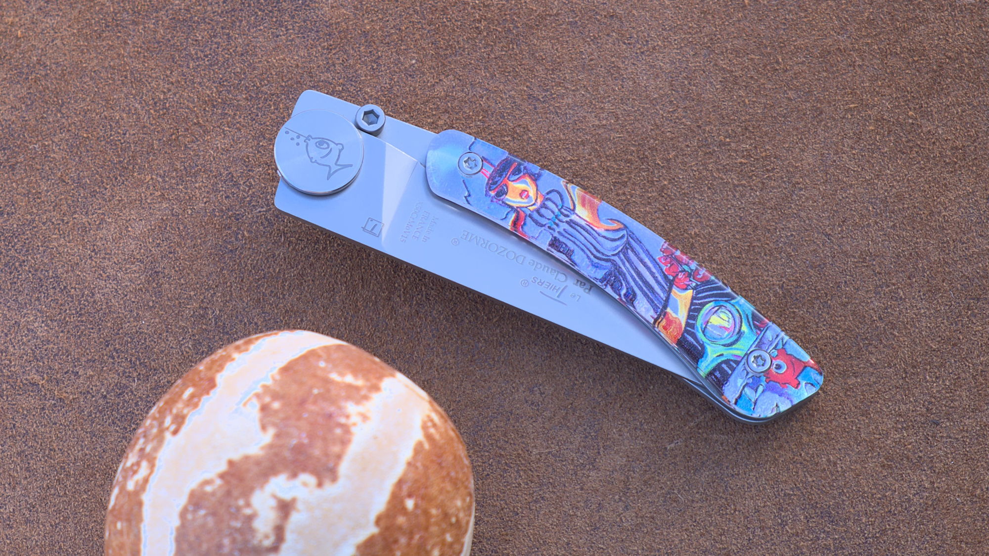 Kunst trifft Messer - Claude Dozorme hat neue Taschenmesser der Serie Liner Lock mit einem außergewöhnlichen Griff entwickelt. Auf dem Griff sind Teile von Kunstwerken abgebildet, die den Messern insgesamt einen frischen, jugendlichen, neuen und modernen Look verleihen. Claude Dozorme hat mit dem Künstler FRANÇOIS GROSLIERE zusammengearbeitet und 6 seiner Werke haben den Weg in den Griff dieser Sonderedition gefunden. Wir finden diese Idee sehr erfrischend und innovativ und freuen uns auf weitere Kombinationen dieser Art. Die Messer haben eine LinerLock Arretierung, sind mit einem Gewicht von 67 g, einer Dicke von 0,9 cm und einer Länge von 10 cm sehr leicht und können praktisch überall verstaut werden. Ein ideales EDC-Messer mit dem besonderen Charme der integrierten Kunst.