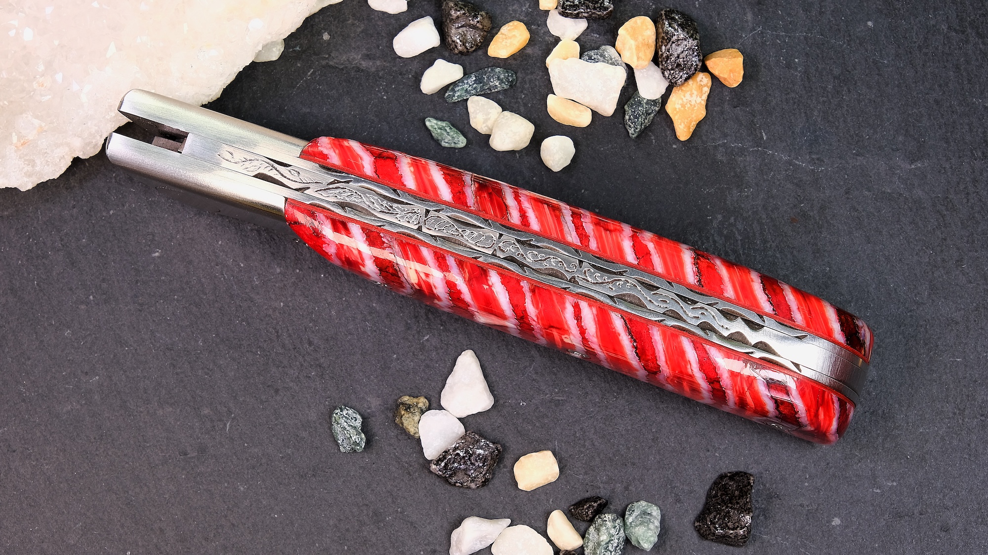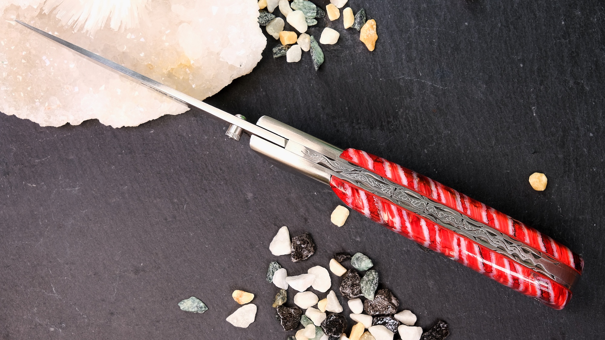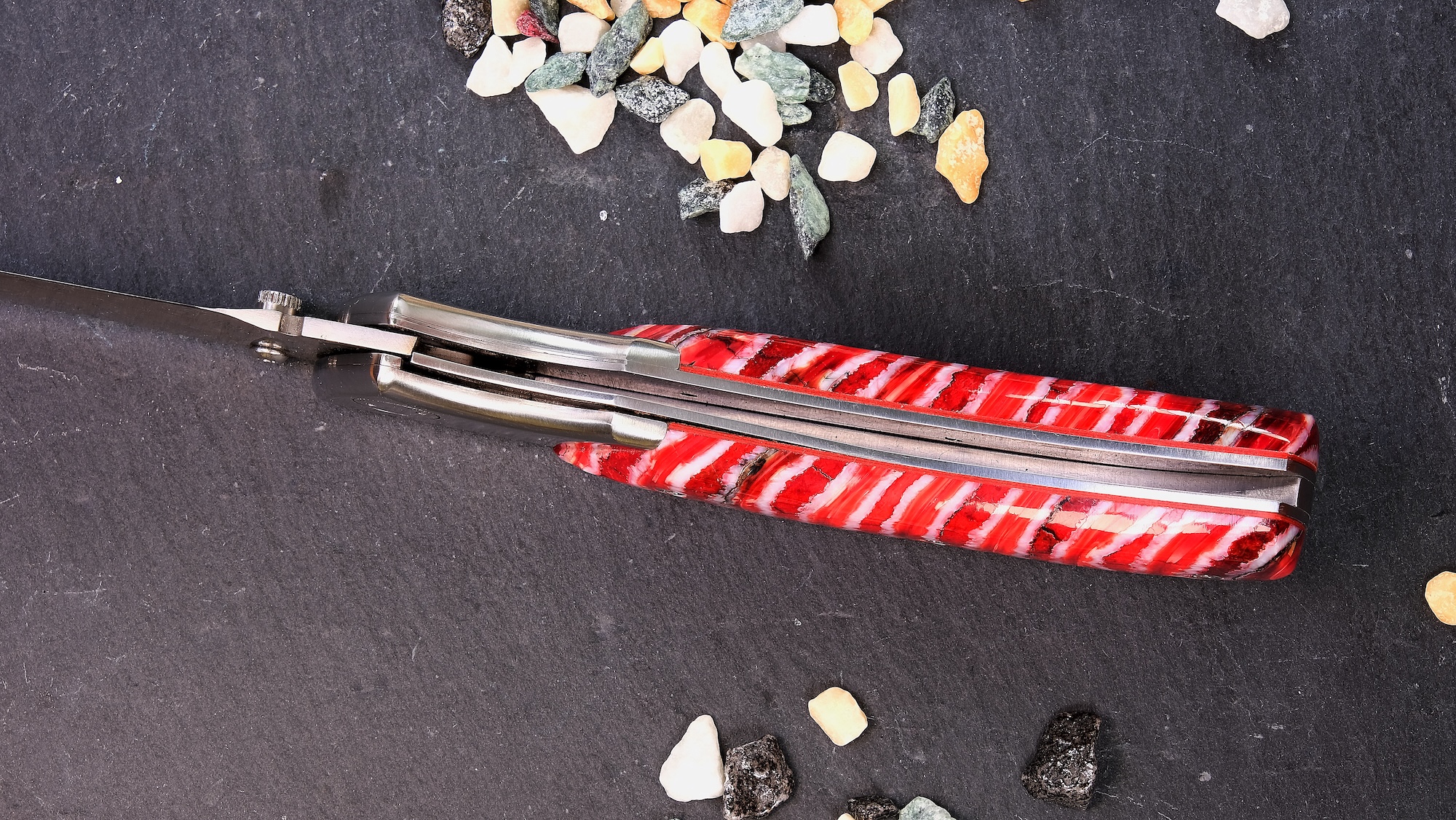 Handgefertigt in Frankreich Dieses Jagdmesser lässt sich einhändig öffnen und verfügt über eine verriegelnde Klinge. In dieser Konfiguration ist es nicht erlaubt, das Messer im öffentlichen Raum zu führen (§ 42a WaffG).