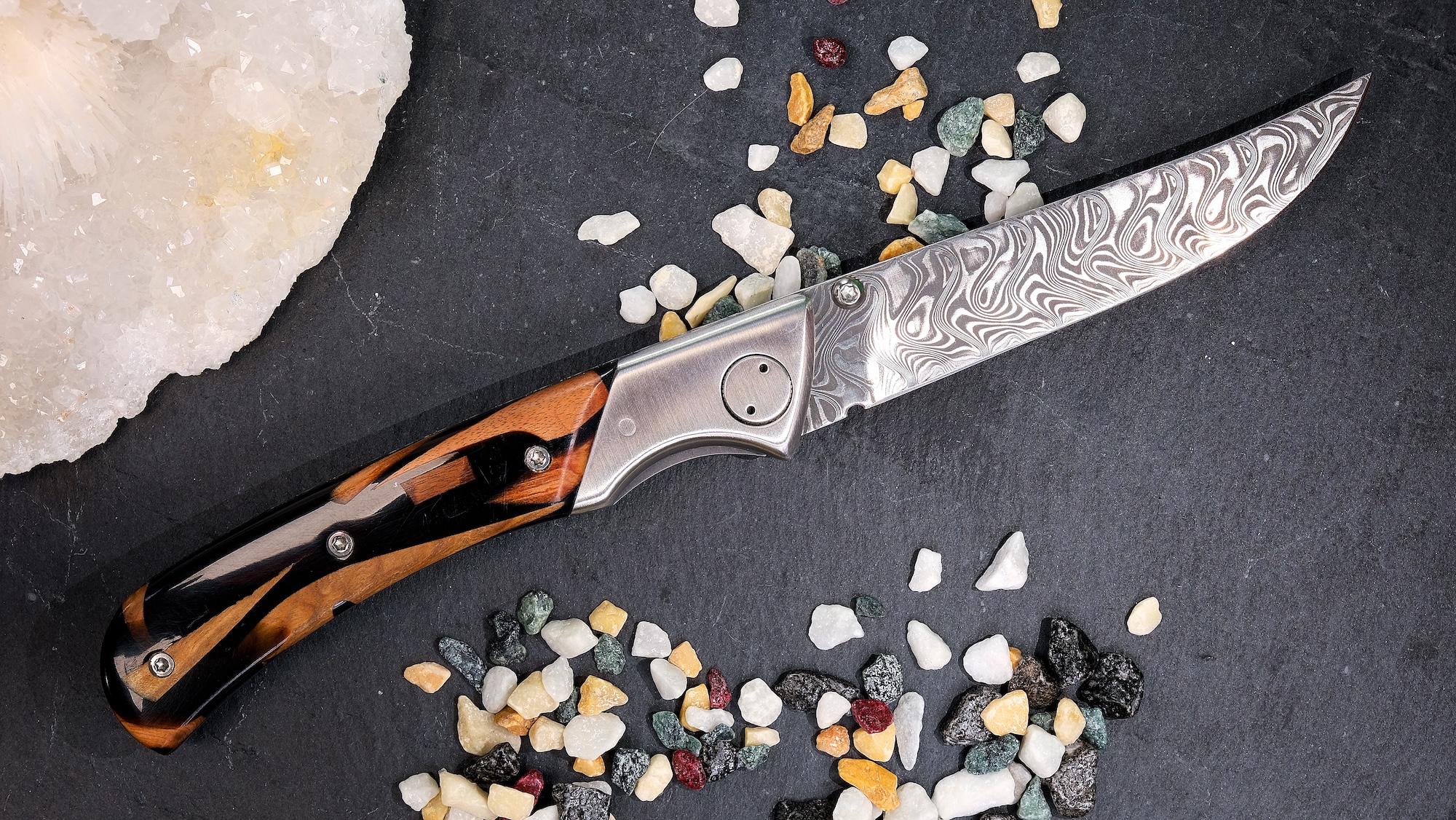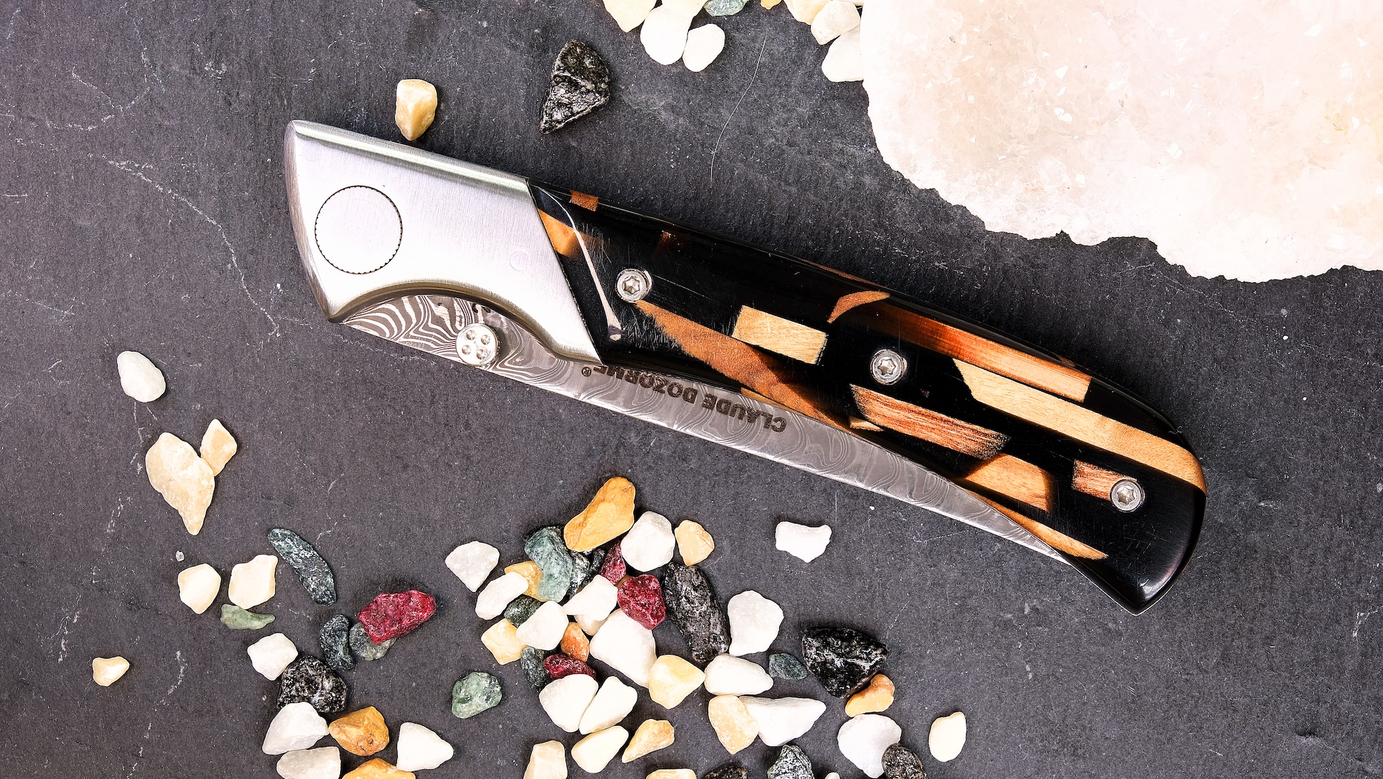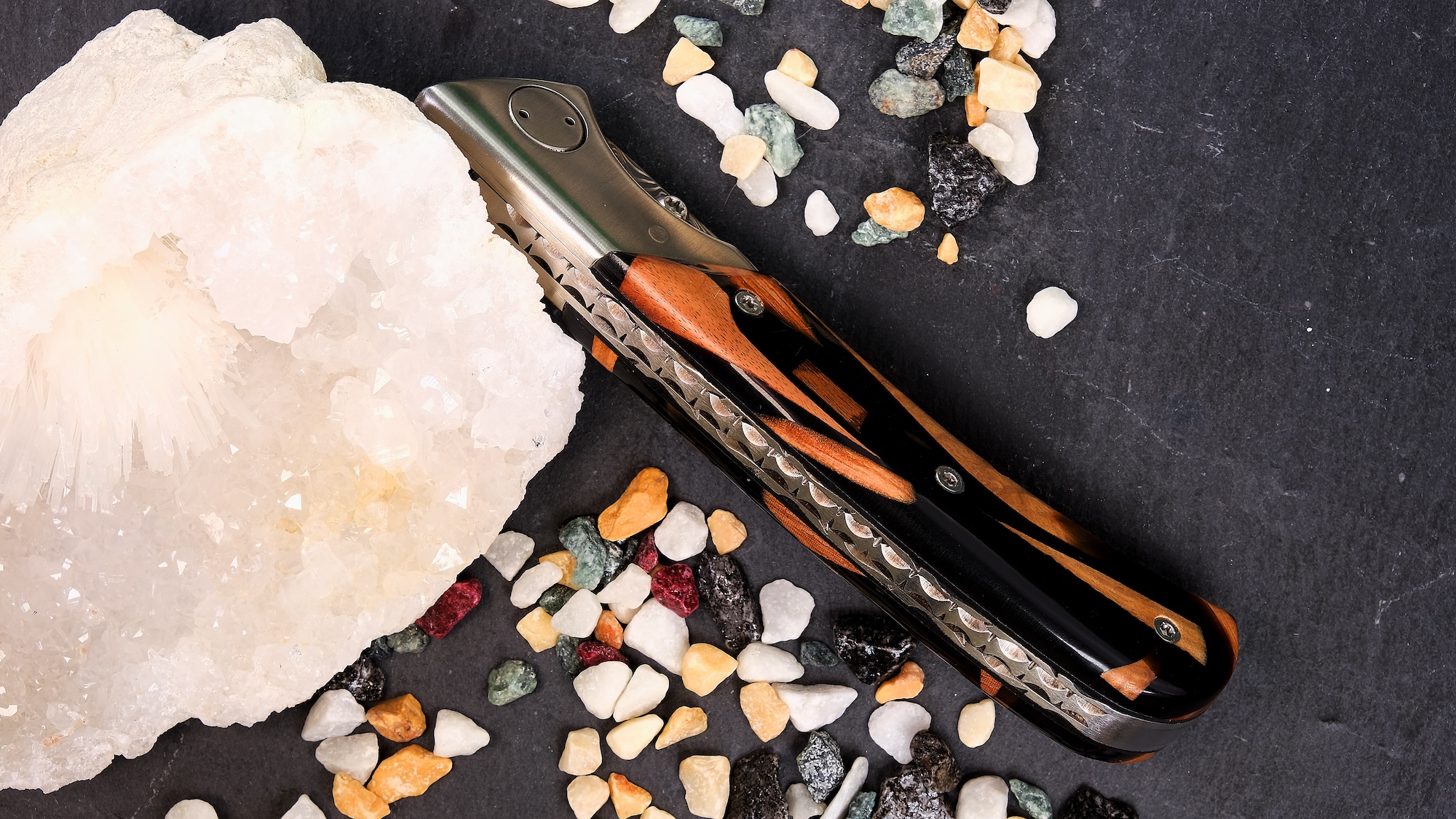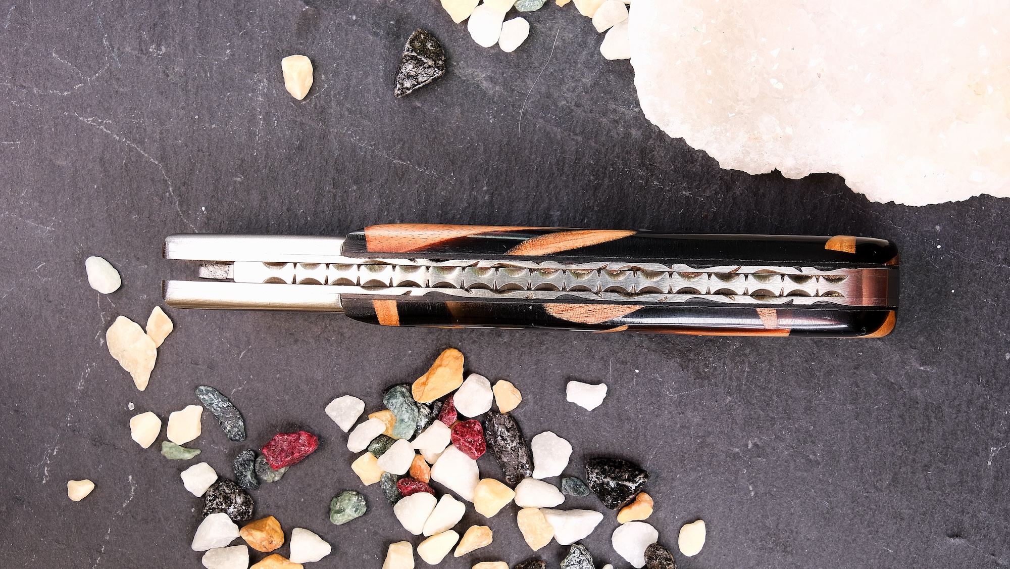Die Verarbeitung ist auf höchstem handwerklichem Niveau: Alle Metalloberflächen sind fein mattiert und harmonieren perfekt mit dem exklusiven Griffmaterial. Besonders hervorzuheben ist der Griff aus Hybridholz, eine wunderschöne Zusammensetzung aus verschiedene Holzstücke und Kunstharz.
