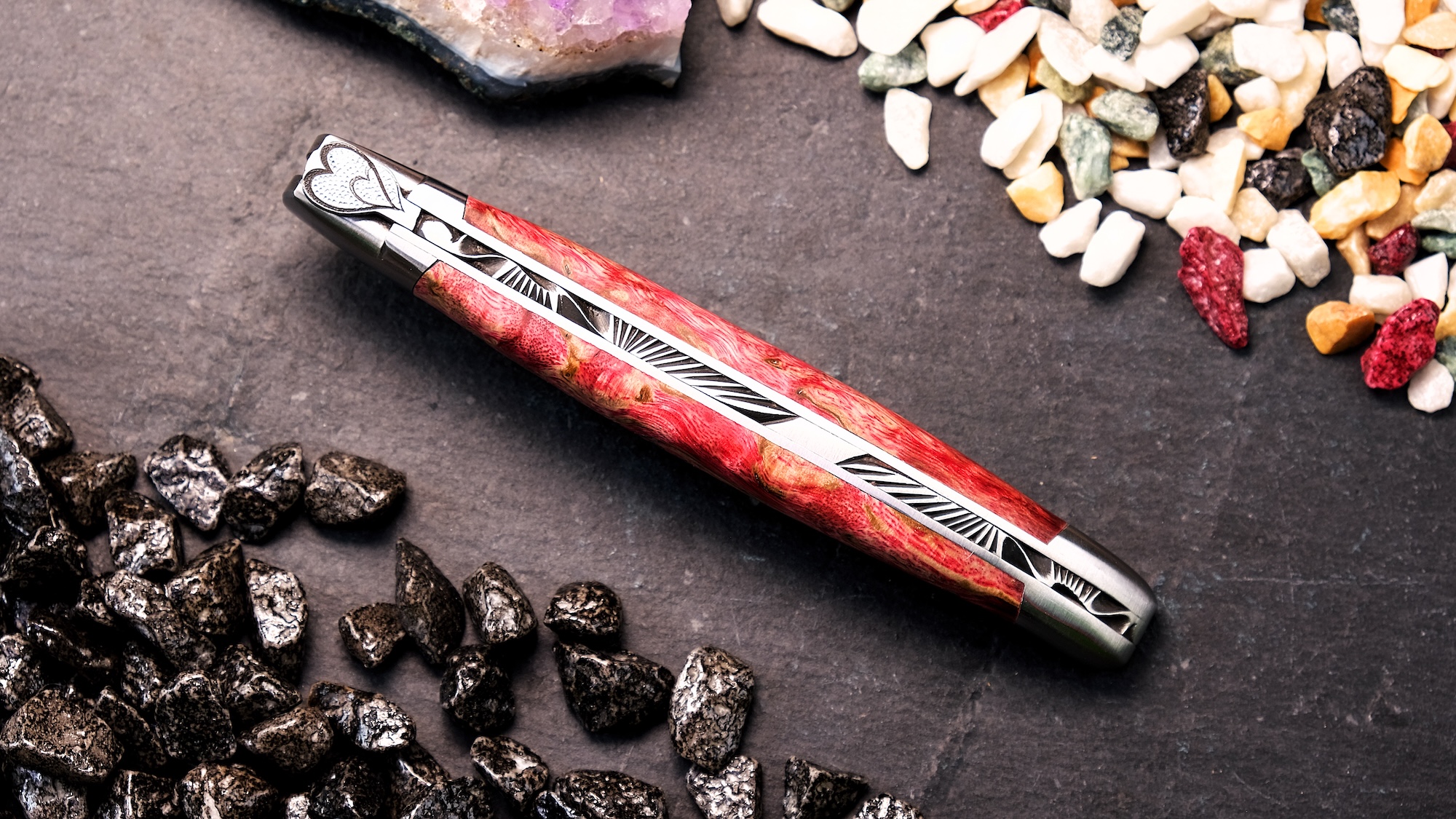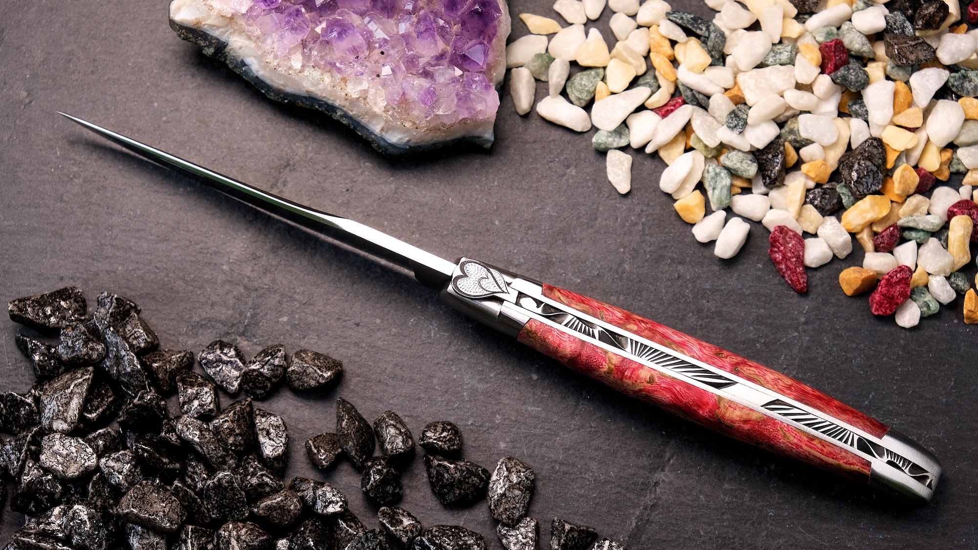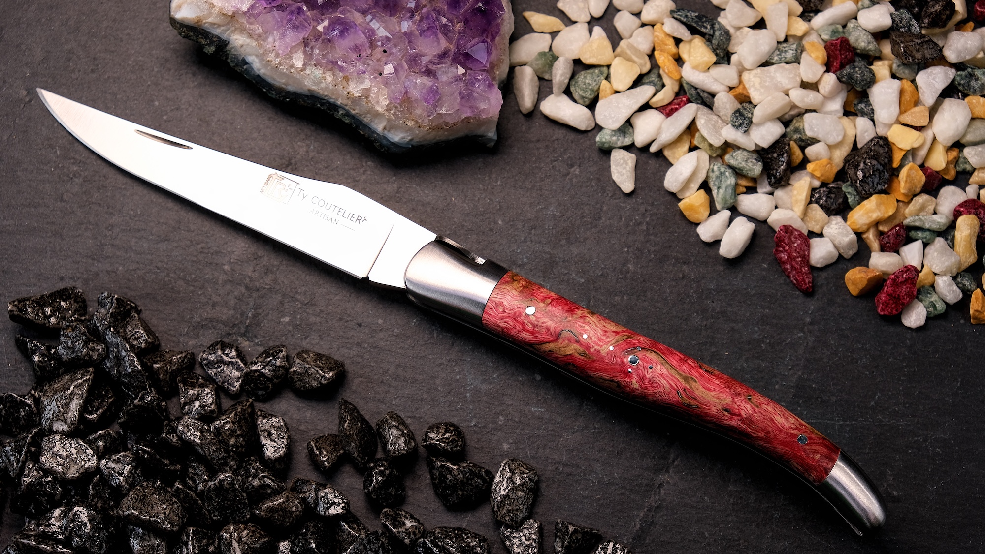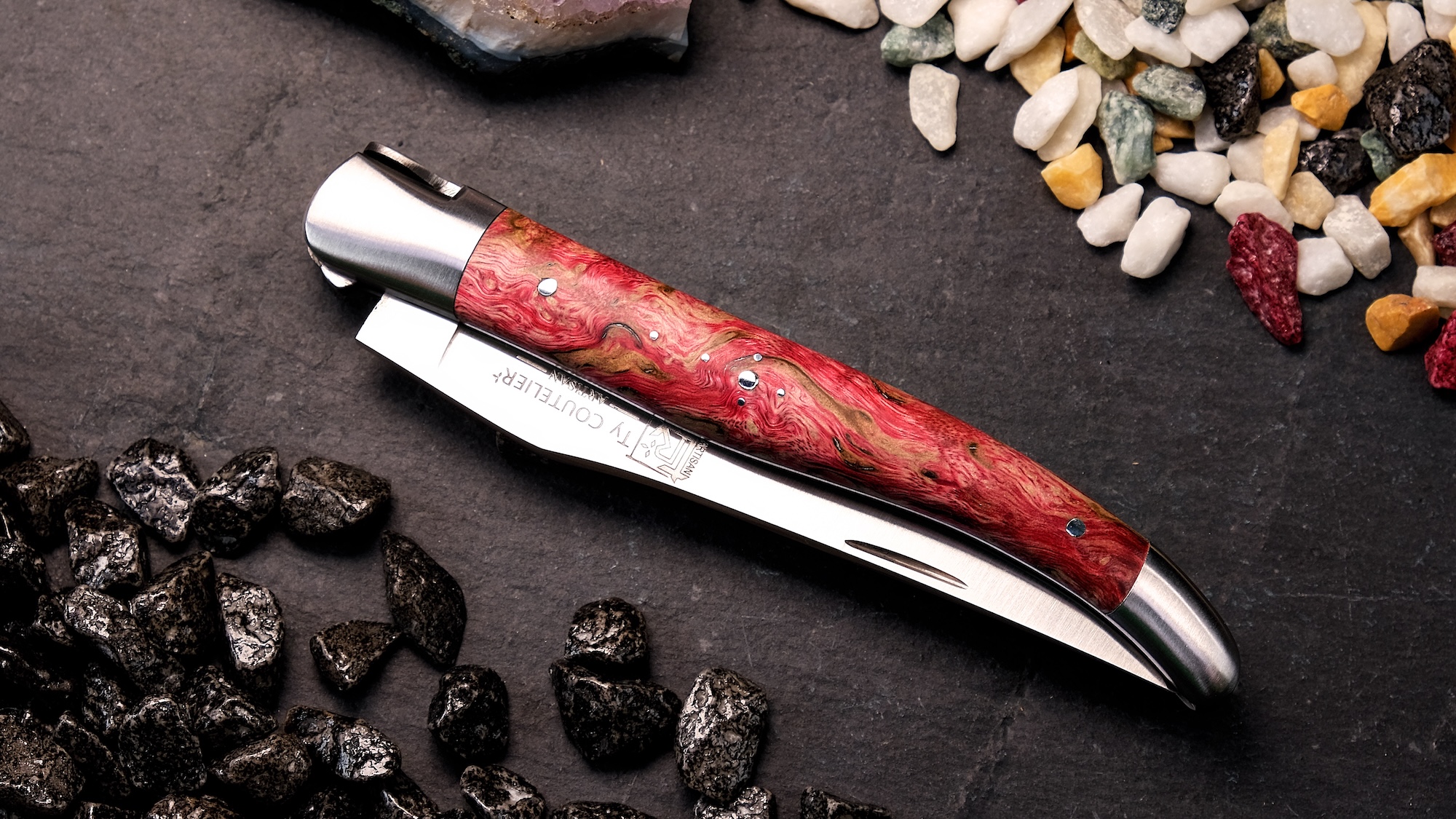 Das Laguiole Edition AKALO 02 aus der Schmiede von Ty Coutelier überzeugt durch seine kraftvolle Farbgebung und die gelungene Verbindung aus traditioneller Handwerkskunst und moderner Veredelung. Der Griff aus stabilisiertem Birkenholz in intensivem Feuerrot wirkt lebendig und ausdrucksstark. Durch die Stabilisierung erhält das Holz nicht nur zusätzliche Widerstandsfähigkeit, sondern auch eine besonders tiefe, gleichmäßige Farbstruktur.