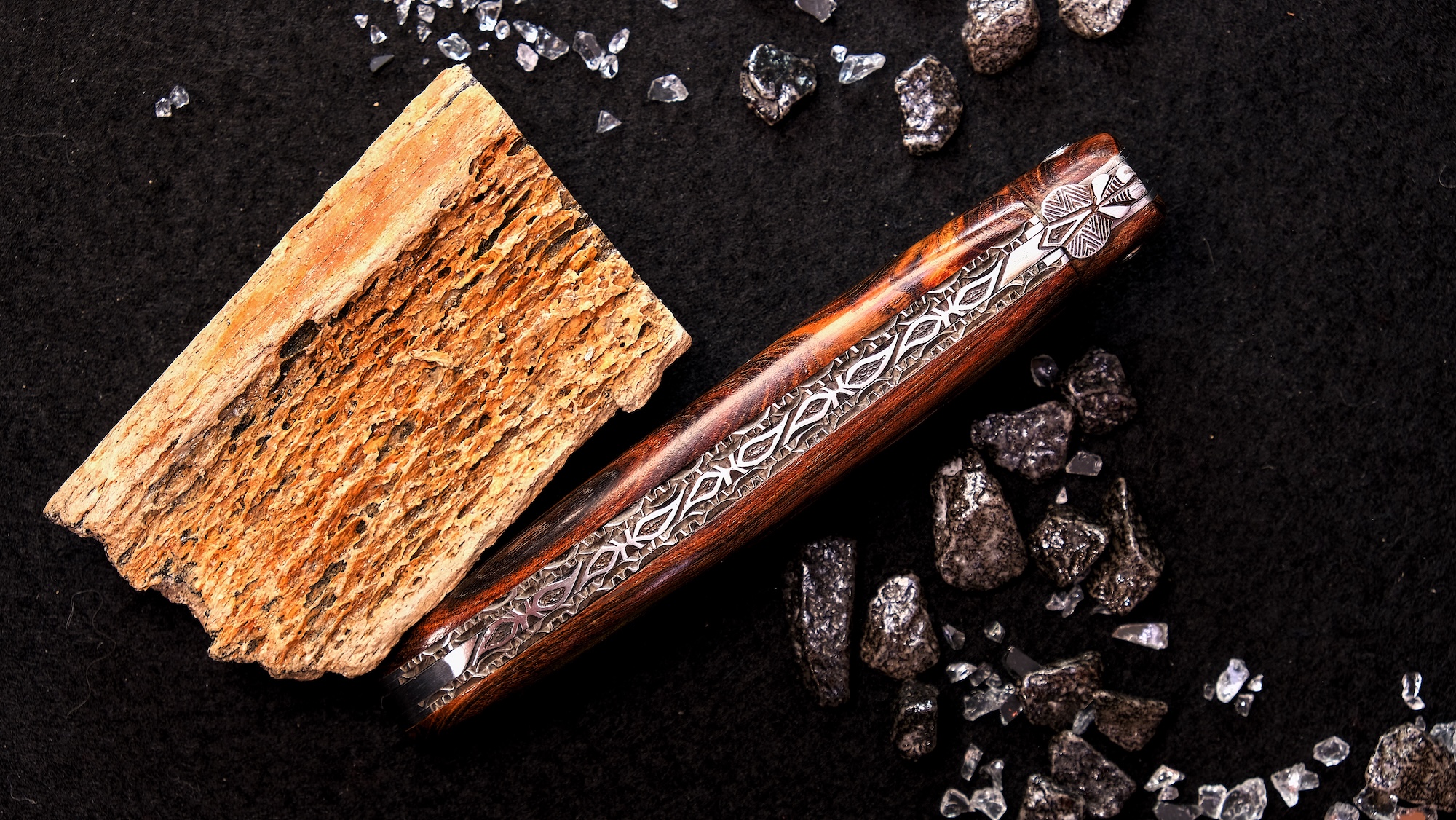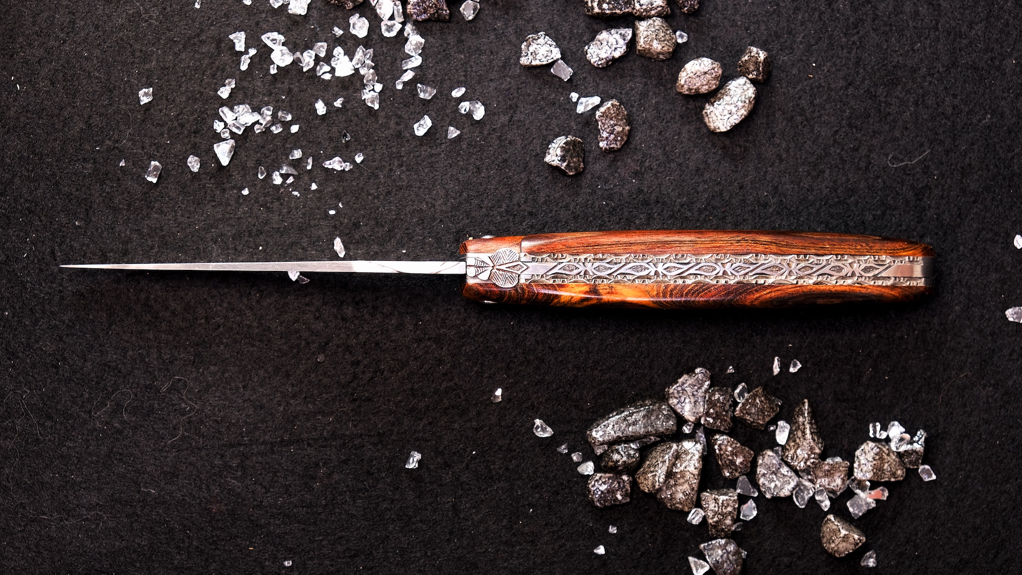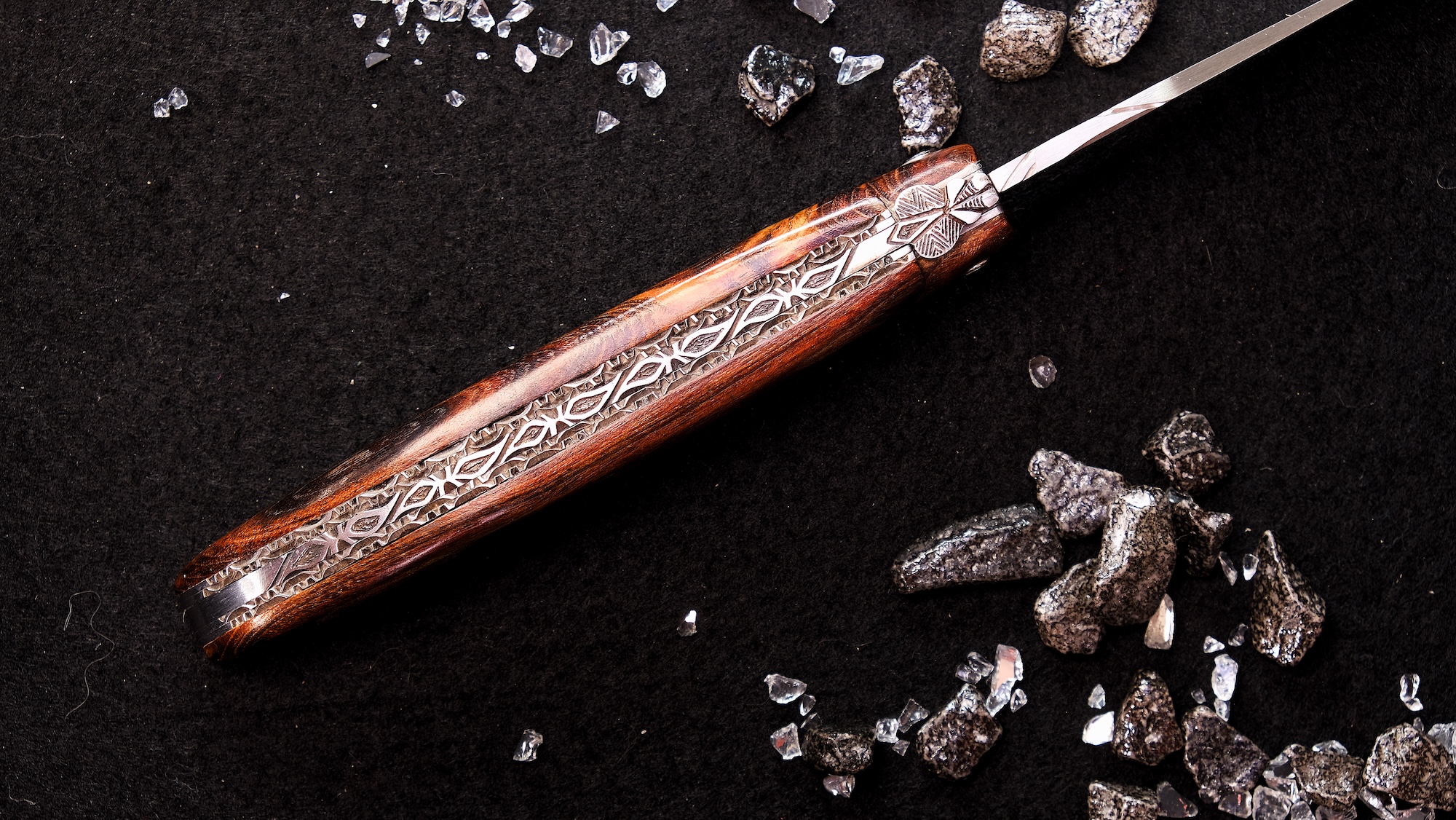 Ein besonderes Merkmal dieser Edition ist die aufwendig gestaltete Doppelplatine am Rücken. Diese sogenannte double Platinen-Ausführung verleiht dem Messer zusätzliche Stabilität und Tiefe, während sie gleichzeitig die kunstvolle Guillochage noch stärker zur Geltung bringt. Das Zusammenspiel aus fein gearbeiteter Feder, doppelten Platinen und natürlichen Materialien schafft eine beeindruckende Gesamtästhetik.