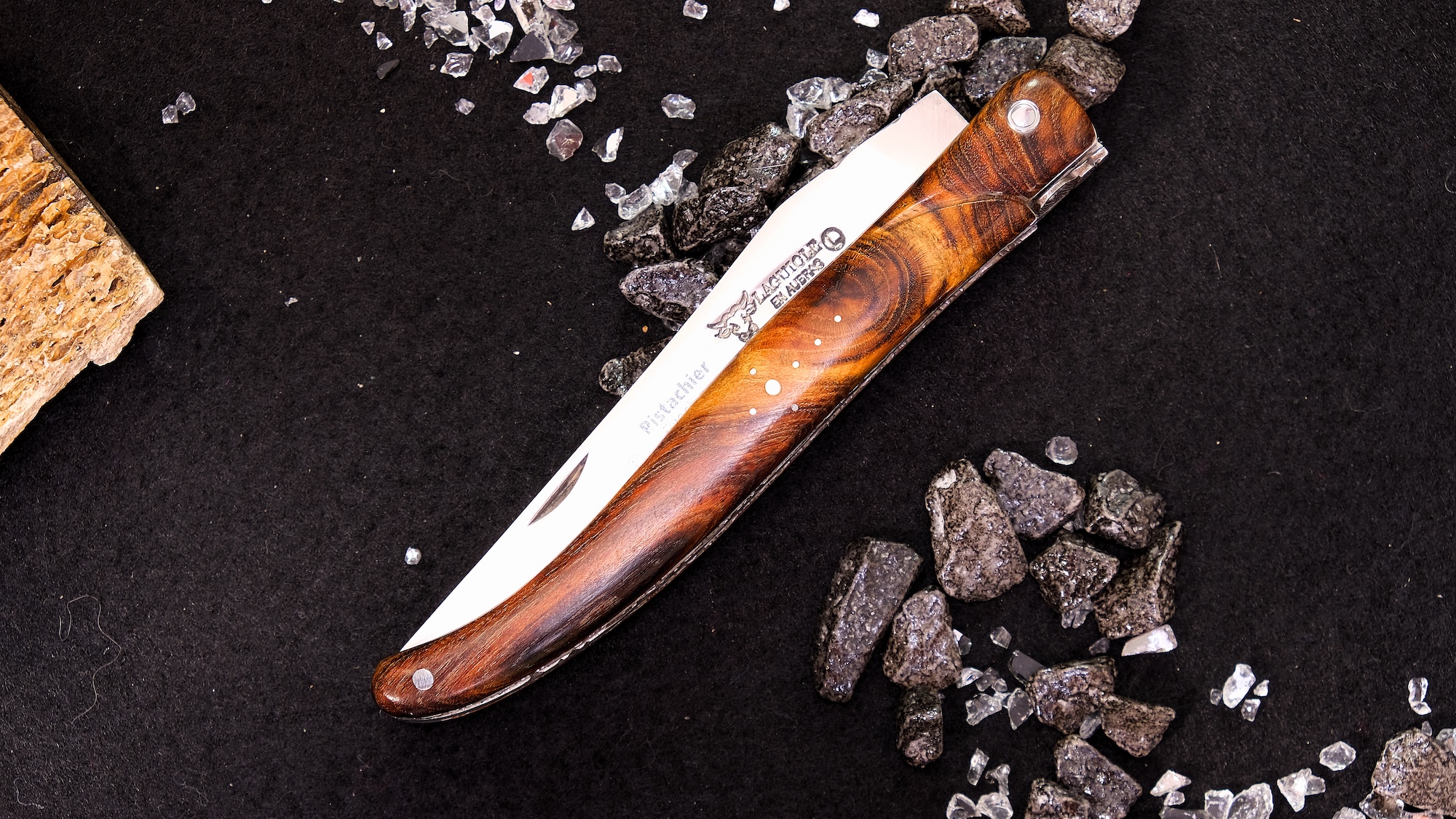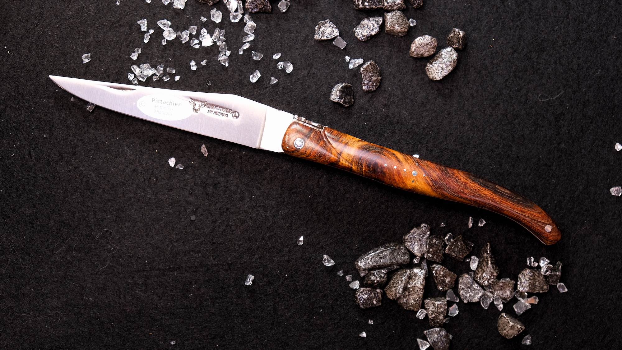 Der Griff aus edlem Pistazienholz fasziniert durch seine warme, natürliche Farbgebung und seine charaktervolle Maserung. Die lebendigen Strukturen des Holzes machen jedes Messer zu einem Unikat und sorgen für eine außergewöhnlich angenehme Haptik. Pistazienholz ist nicht nur optisch ein Highlight, sondern auch für seine Robustheit und Langlebigkeit geschätzt.