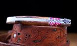 Die Backenzähne des Mammuts gehören zu den wohl schönsten und beeindruckensten Griffmaterialien überhaupt. Die wunderschöne Färbung im Material kommt durch die Einlagerung von verschiedenen Mineralien aus dem Boden des Fundortes und die Farbe des Kunstharzes, die zum Stabilisieren benutzt wurde.
