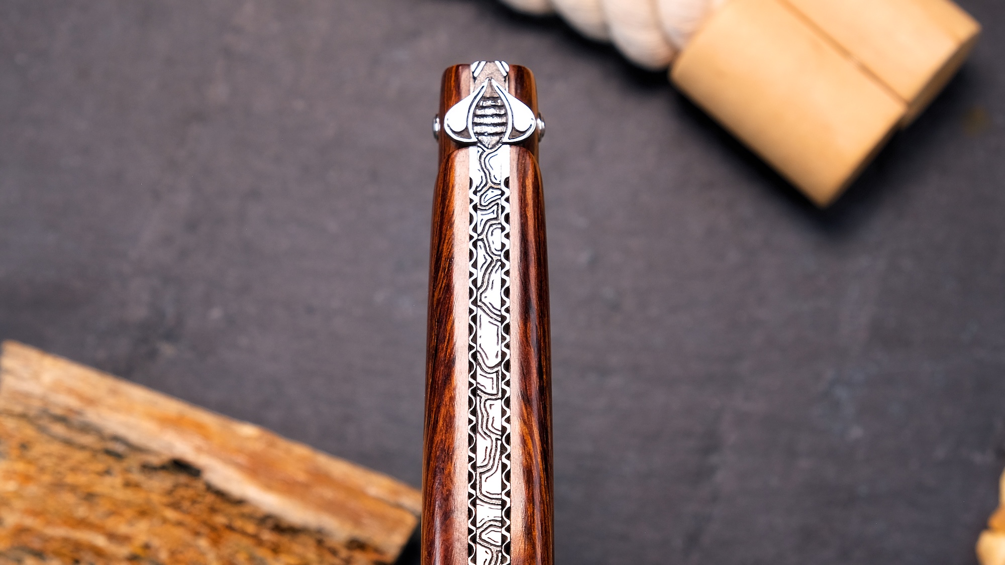 Im Zentrum steht die modern interpretierte Biene mit klaren, reduzierten Linien. Sie bricht bewusst mit klassischen Formen und verleiht dem Messer eine dynamische, zeitgemäße Ausstrahlung – Symbol für Ausdauer, Präzision und die lebendige Weiterentwicklung der Laguiole-Tradition.