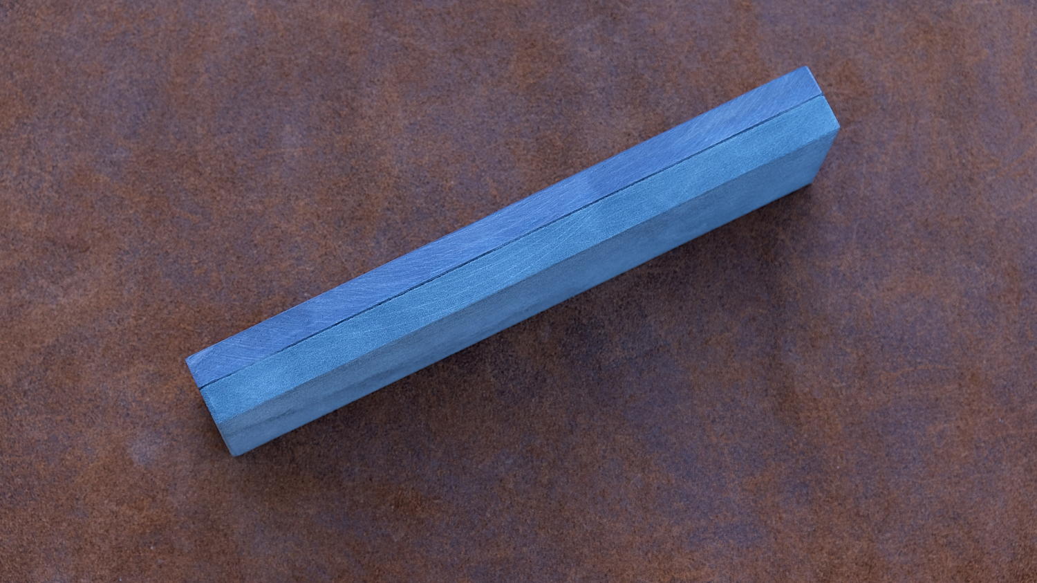 Methode 2 (die violette, feinere Seite des Steins): Man reibt ein Stück des gleichen Steins auf diesem, dann entsteht auf der Oberfläche eine Schlammschicht, wenn man es natürlich mit ein wenig mit Wasser behandelt. Wenn man das Messer auf dieser Schlammschicht auf dem Stein schleift, entspricht dies einer Körnung von ca. 3.000. Der Schlamm enthält kleine natürliche Partikel, die beim Schleifen entsprechend helfen. Das zusätzliche kleine Stück für die Erzeugung des Schlamms ist bereits im Preis enthalten.