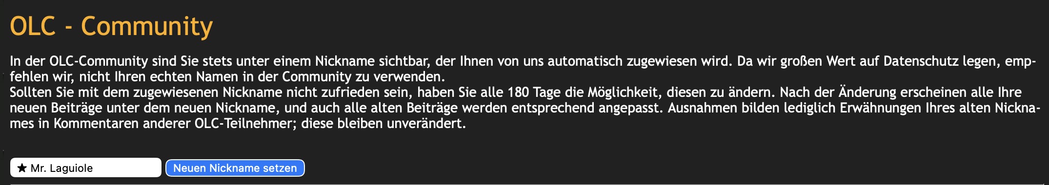 Wenn Sie das erste Mal in der Original-Laguiole-Community (OLC) oder MyChat unterwegs sind, erhalten Sie ein von uns zufällig erteilter Nickname. Hier im Kundenbereich unter Persönliche Daten können Sie Ihr Nickname in der OLC alle 180 Tage ändern.