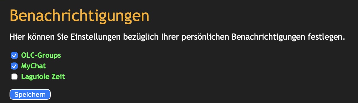 In der OLC-Groups in MyChat und in der Laguiole-Zeit können Sie eMail-Benachrichtigungen erhalten, wenn neue Informationen für Sie da sind. Allerdings kann das auch schon mal schnell viel sein, deswegen bieten wir Ihnen die Möglichkeit hier zu bestimmen, ob Sie entsprechende eMails darüber erhalten oder nicht.