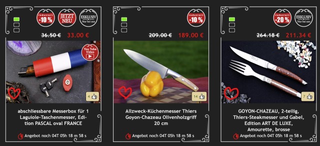 Beispiel: Ich habe zwei Messer mit Mammutgriff aus zwei verschiedenen Schmieden, da ist ein direkter Vergleich mit Zoomfunktion nachtürlich super, so kann man beide Messer perfekt miteinander vergleichen, fast so, als würde man am Verkaufstresen stehen, und beide Messer in die Hand nehmen können.