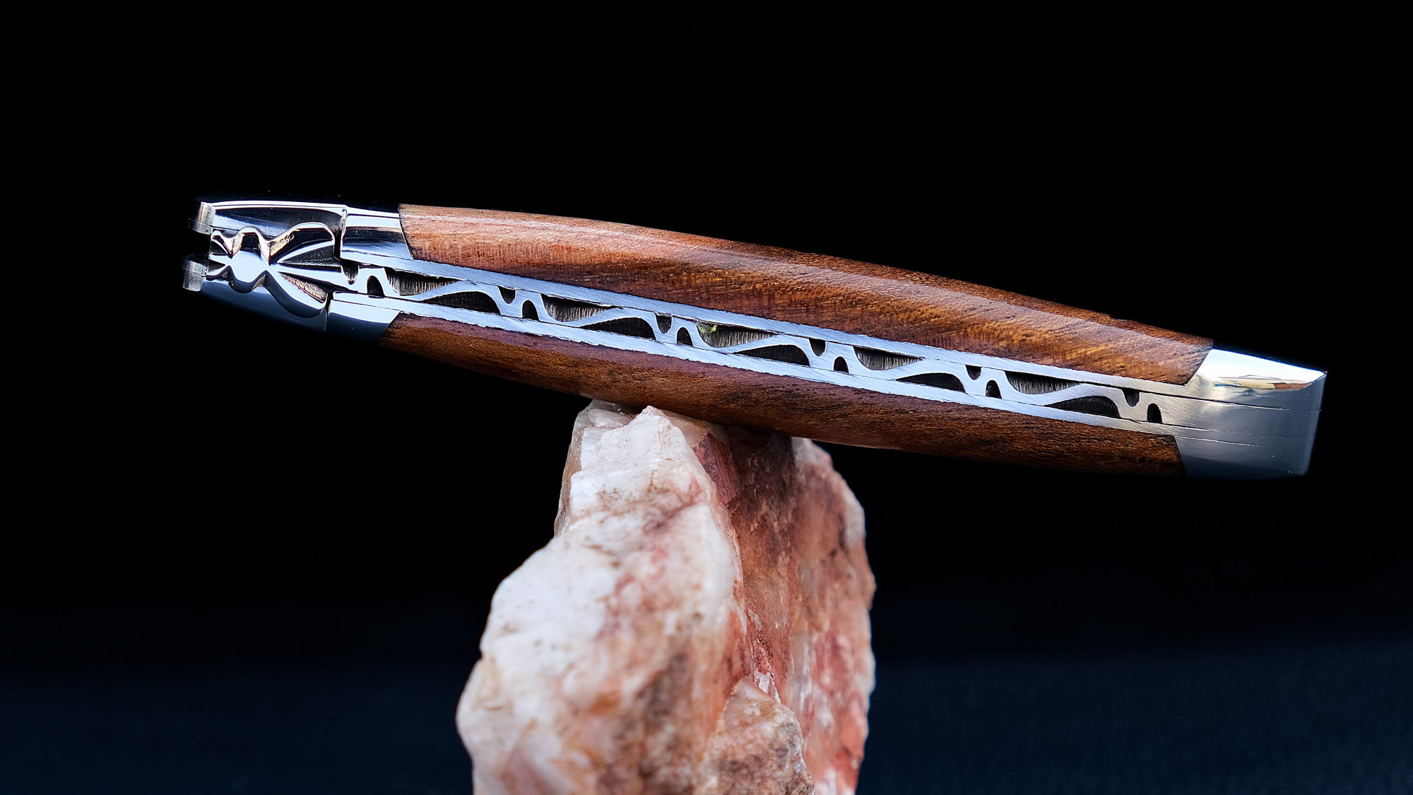 Der Lebensbaum (Thuya) mit seiner einzigartigen Maserung und seinem angenehmen Duft gab das Holz für die Griffschalen dieses Laguiole- Messers!